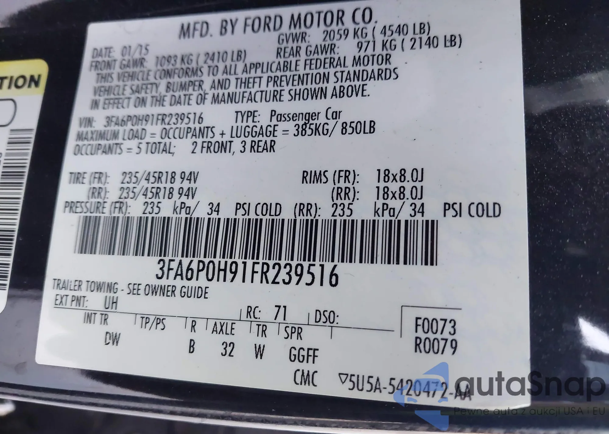 LOT: 42810237 VIN: 3FA6P0H91FR239516