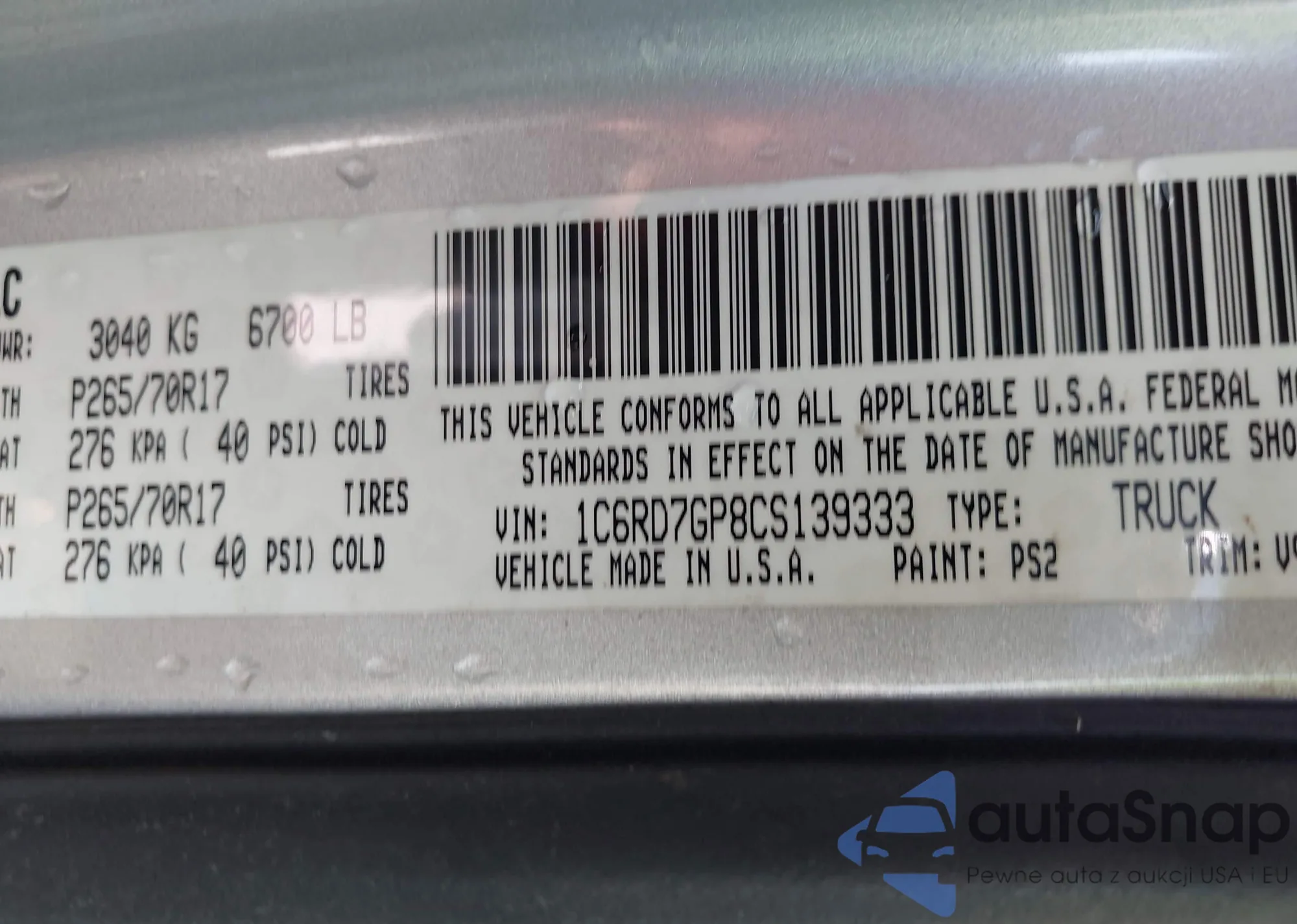 • VIN 1C6RD7GP8CS139333