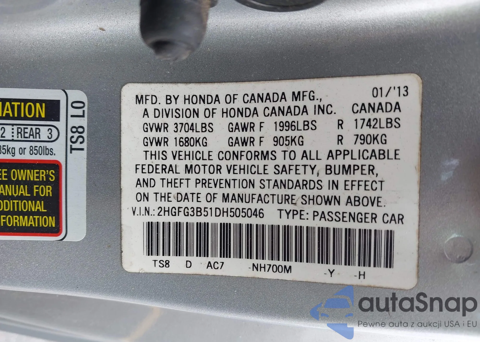 • VIN 2HGFG3B51DH505046