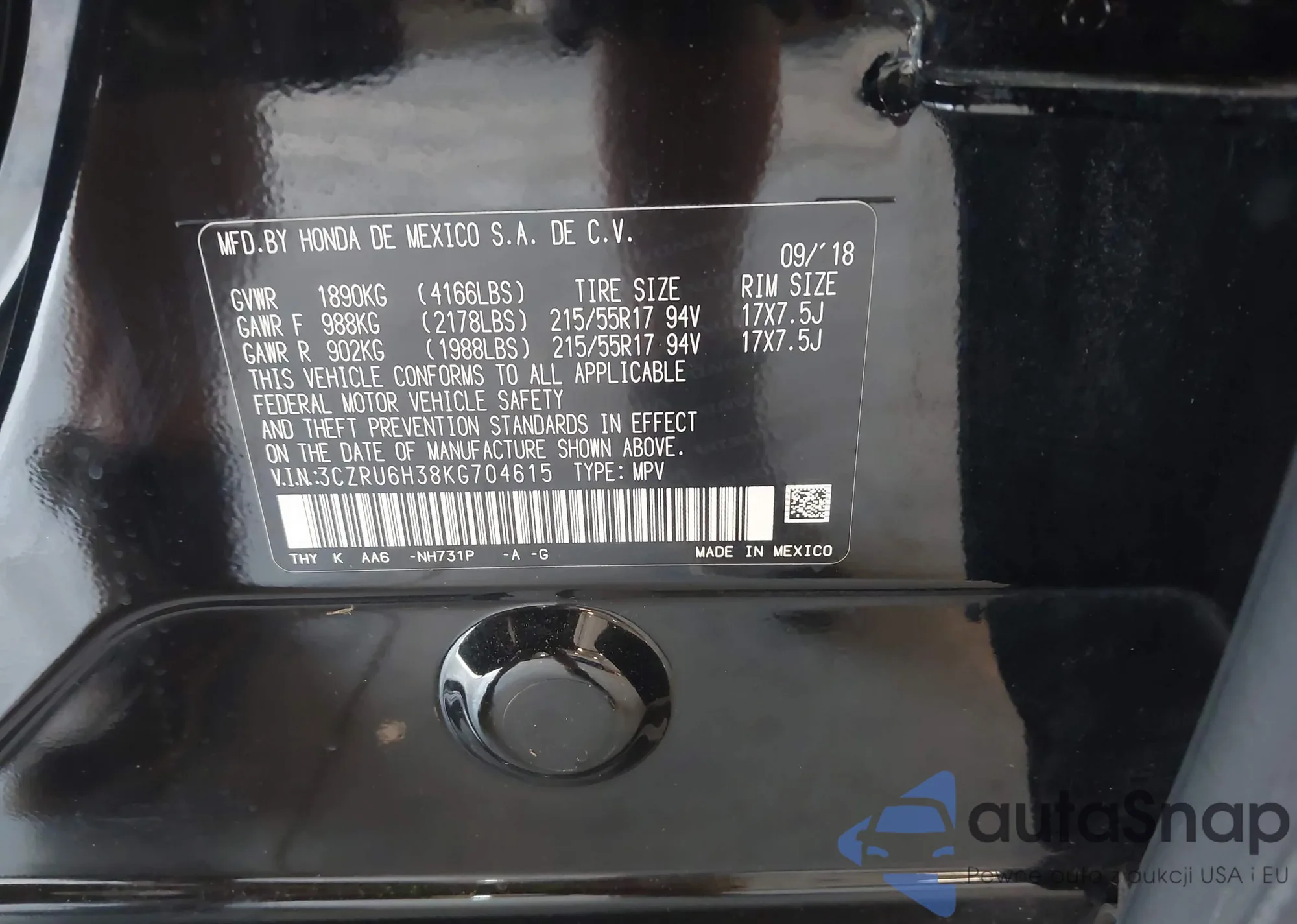 • VIN 3CZRU6H38KG704615