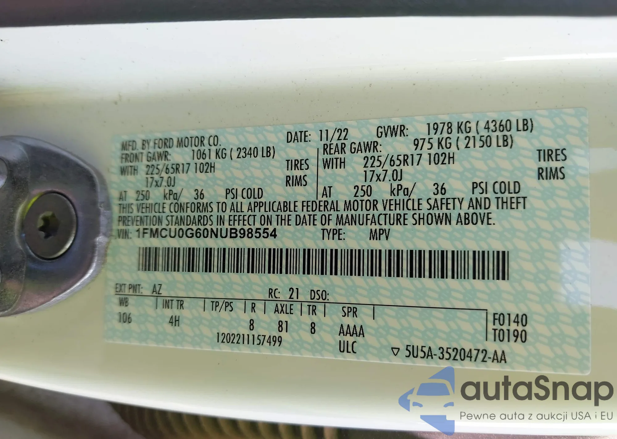 • VIN 1FMCU0G60NUB98554