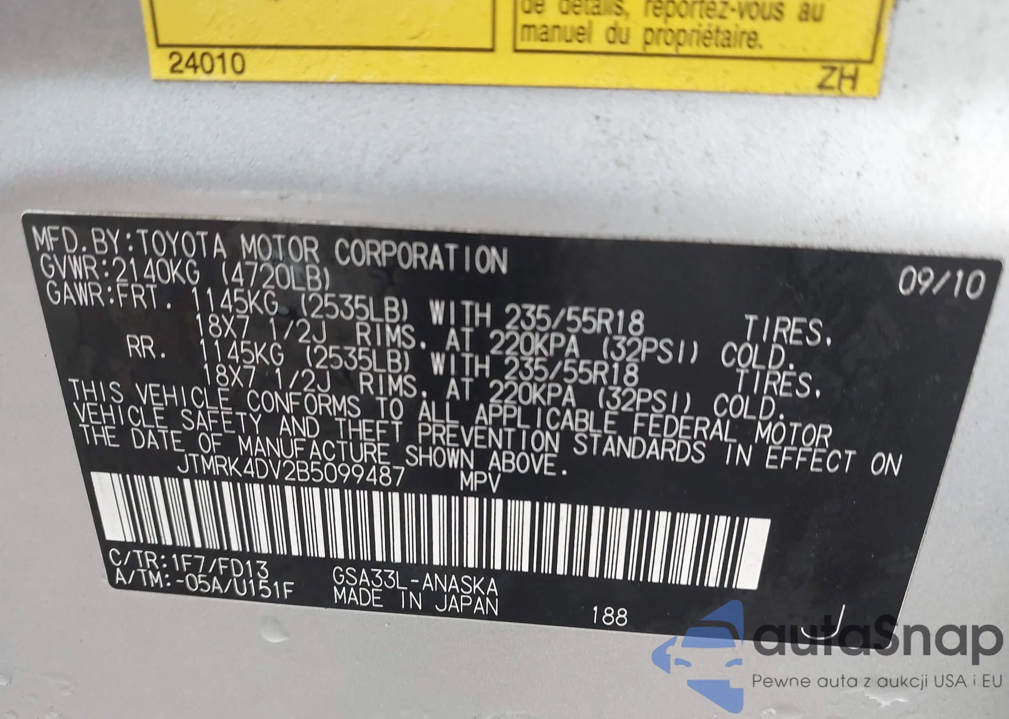 LOT: 42728843 VIN: JTMRK4DV2B5099487
