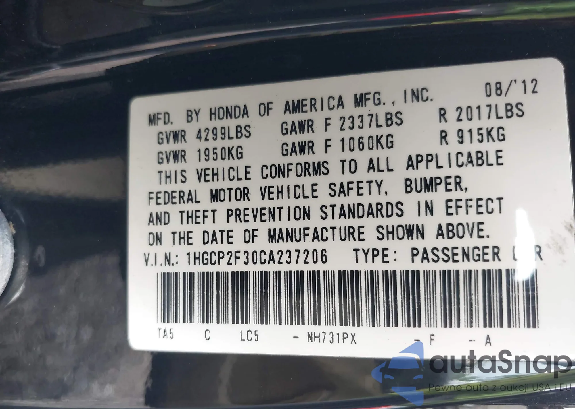• VIN 4T1BF1FK1CU041087