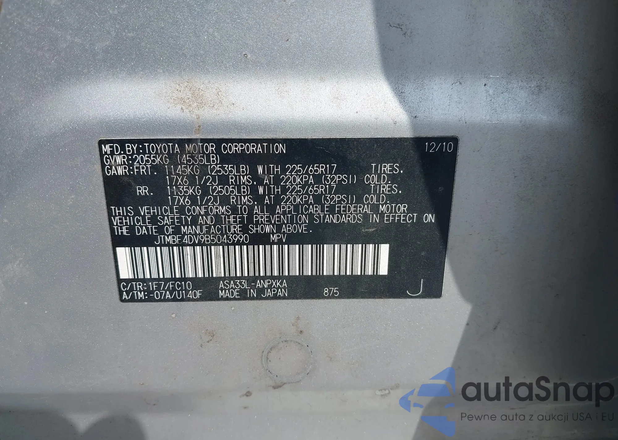 LOT: 42752249 VIN: JTMBF4DV9B5043990