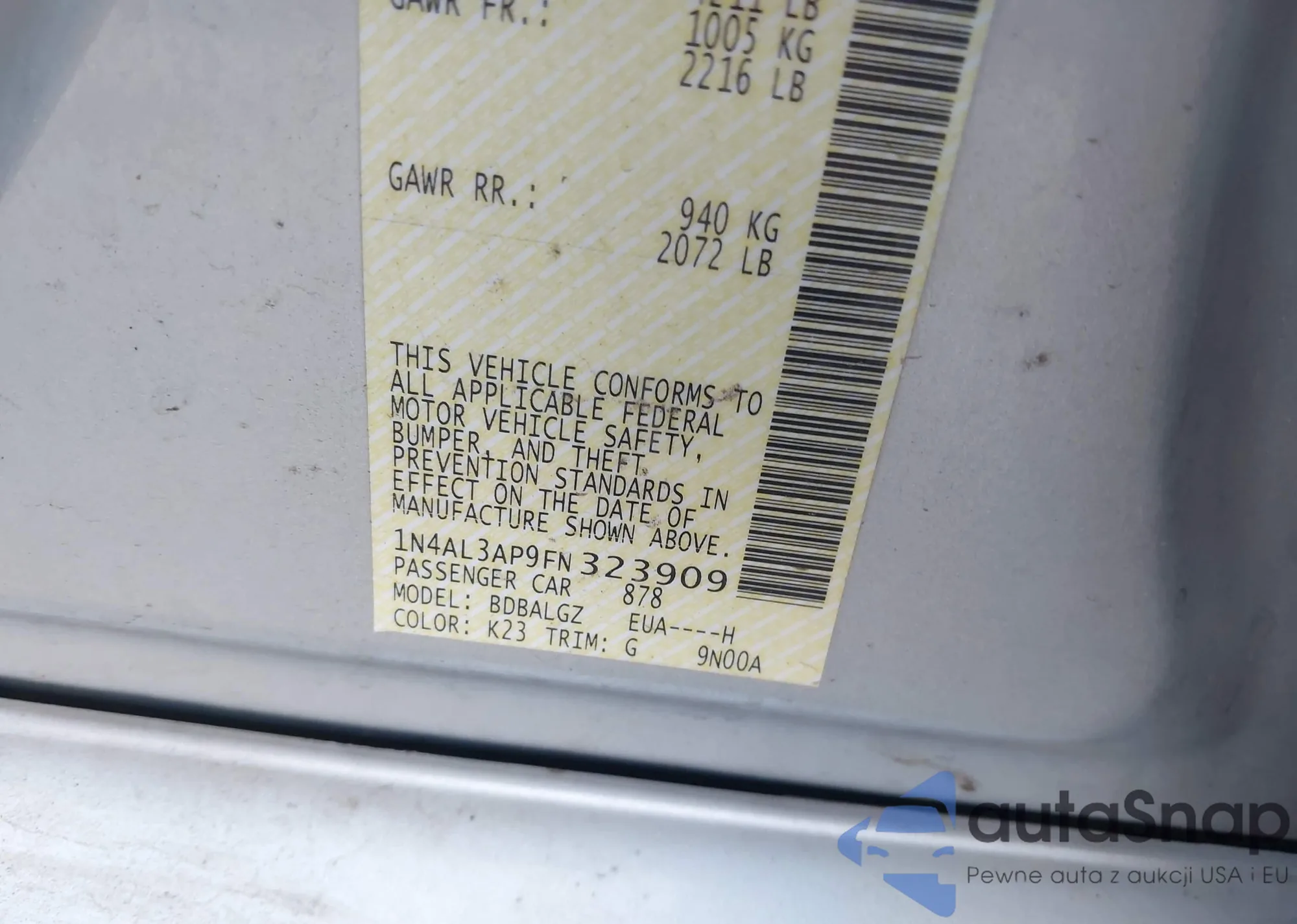• VIN 1N4AL3AP9FN323909