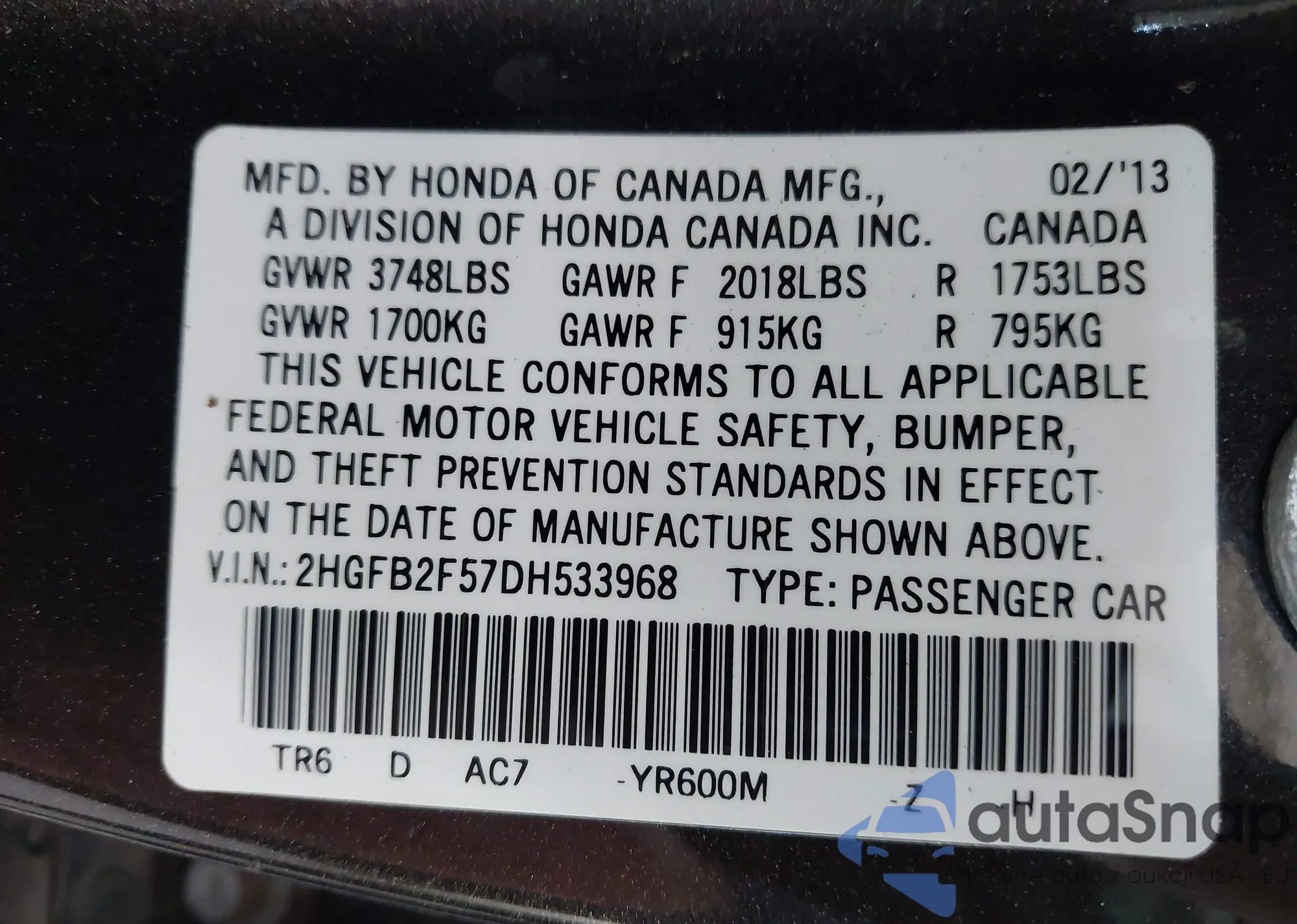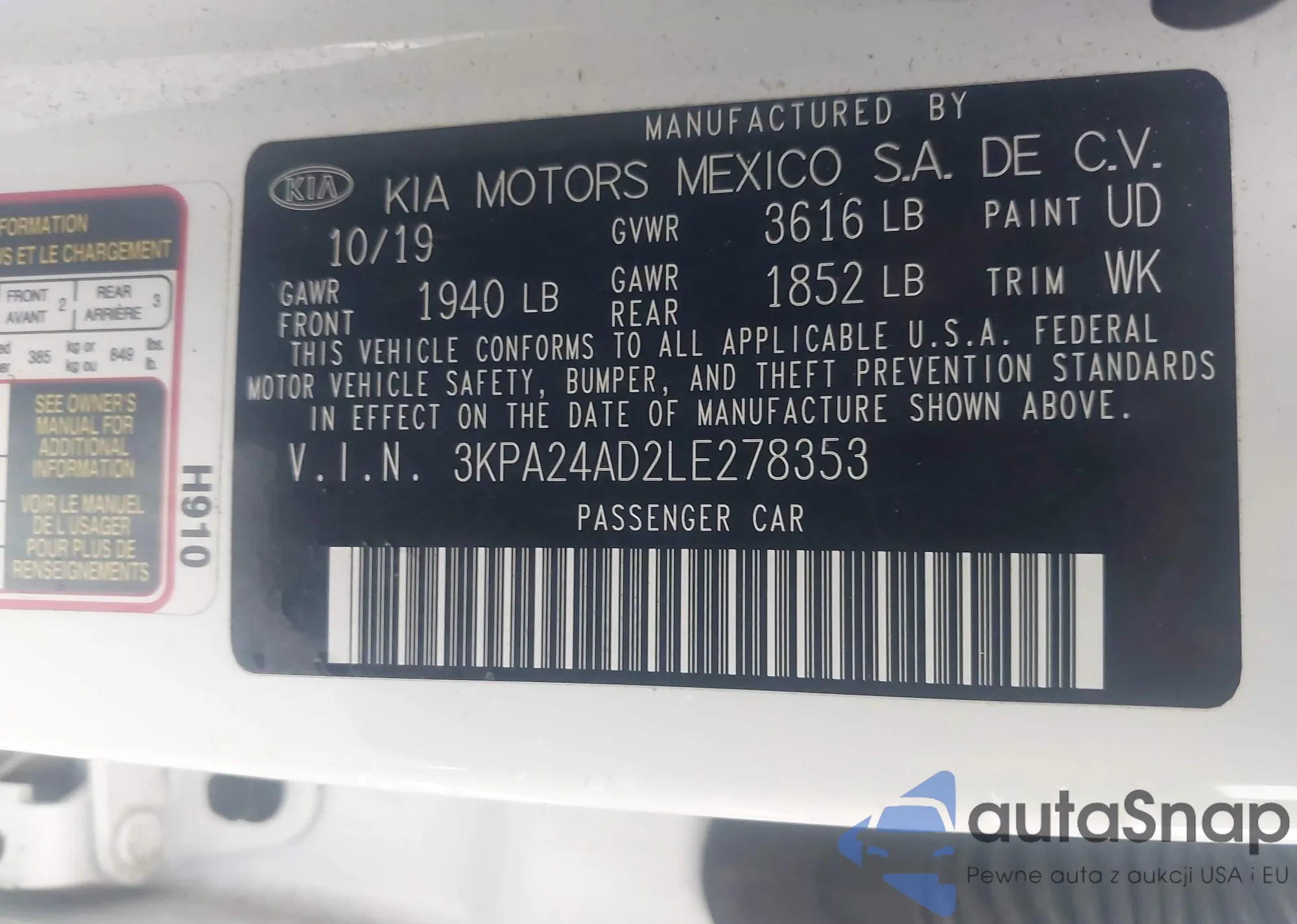 LOT: 42942263 VIN: KNDPB3A26D7391968