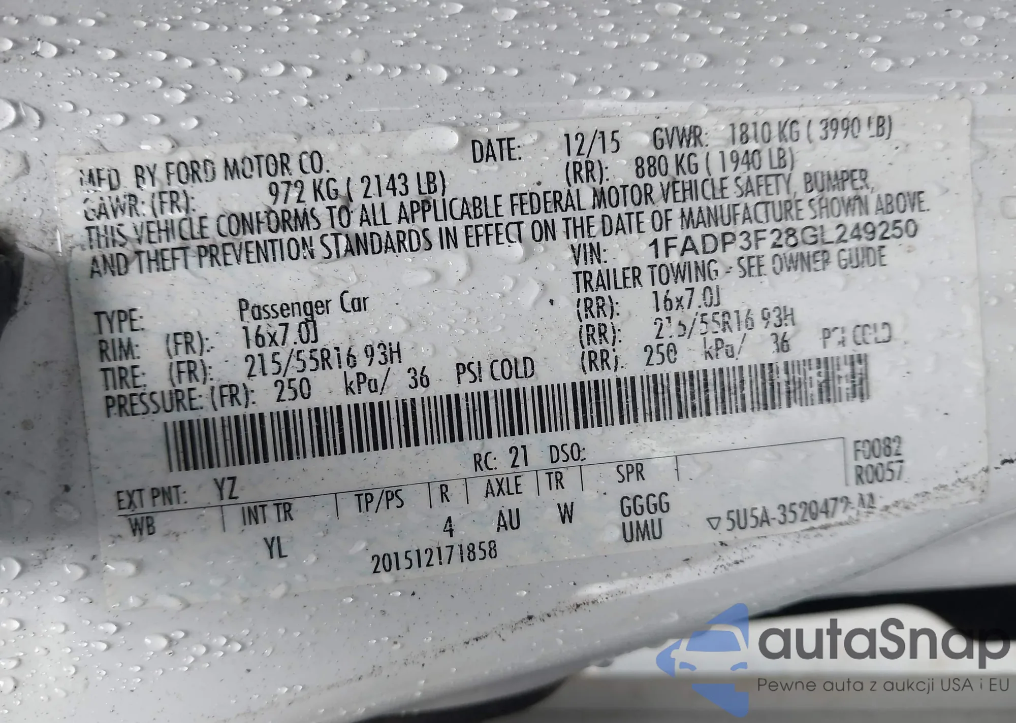 LOT: 42894957 VIN: 1FADP3F28GL249250