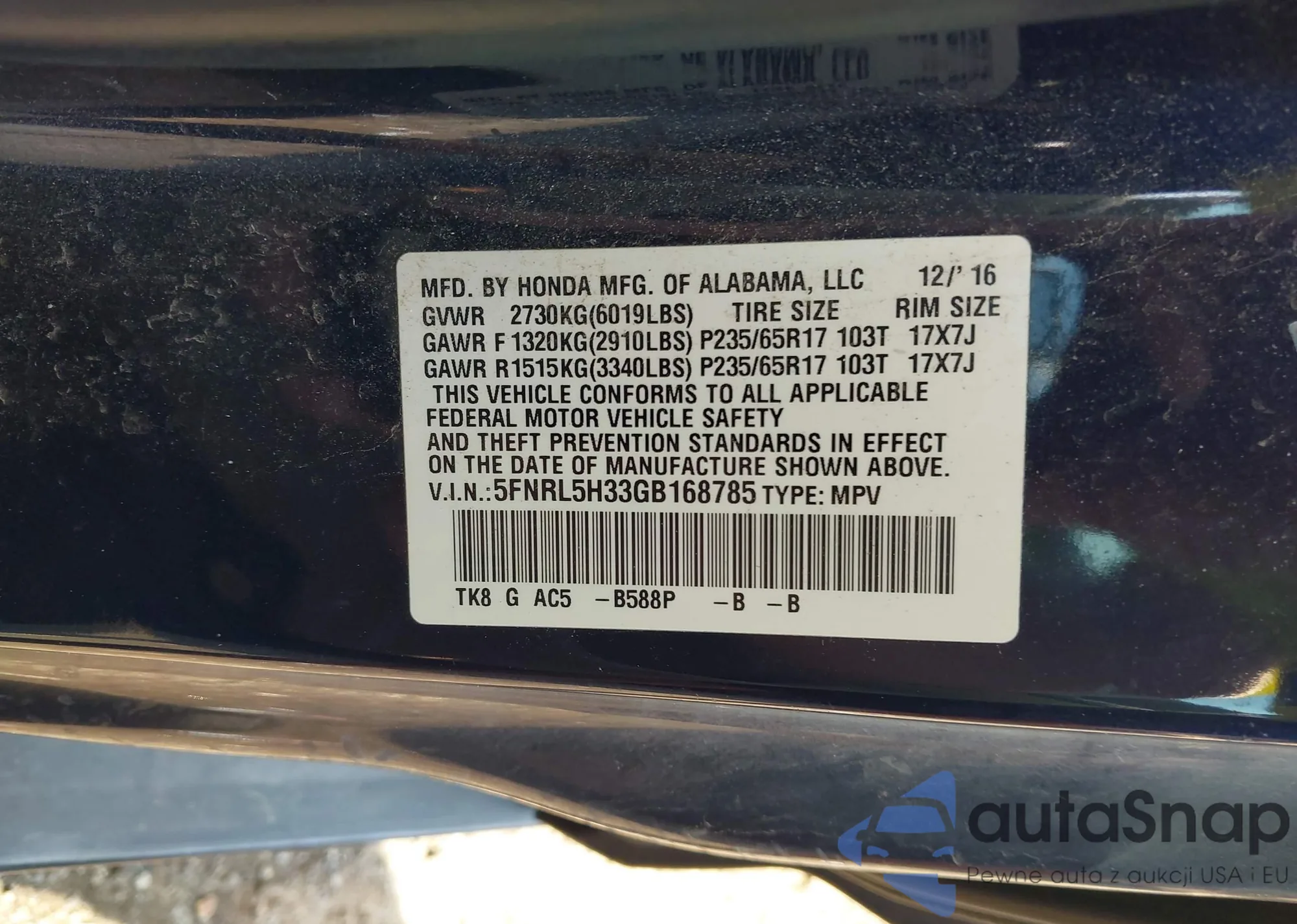 • VIN 5FNRL5H33GB168785