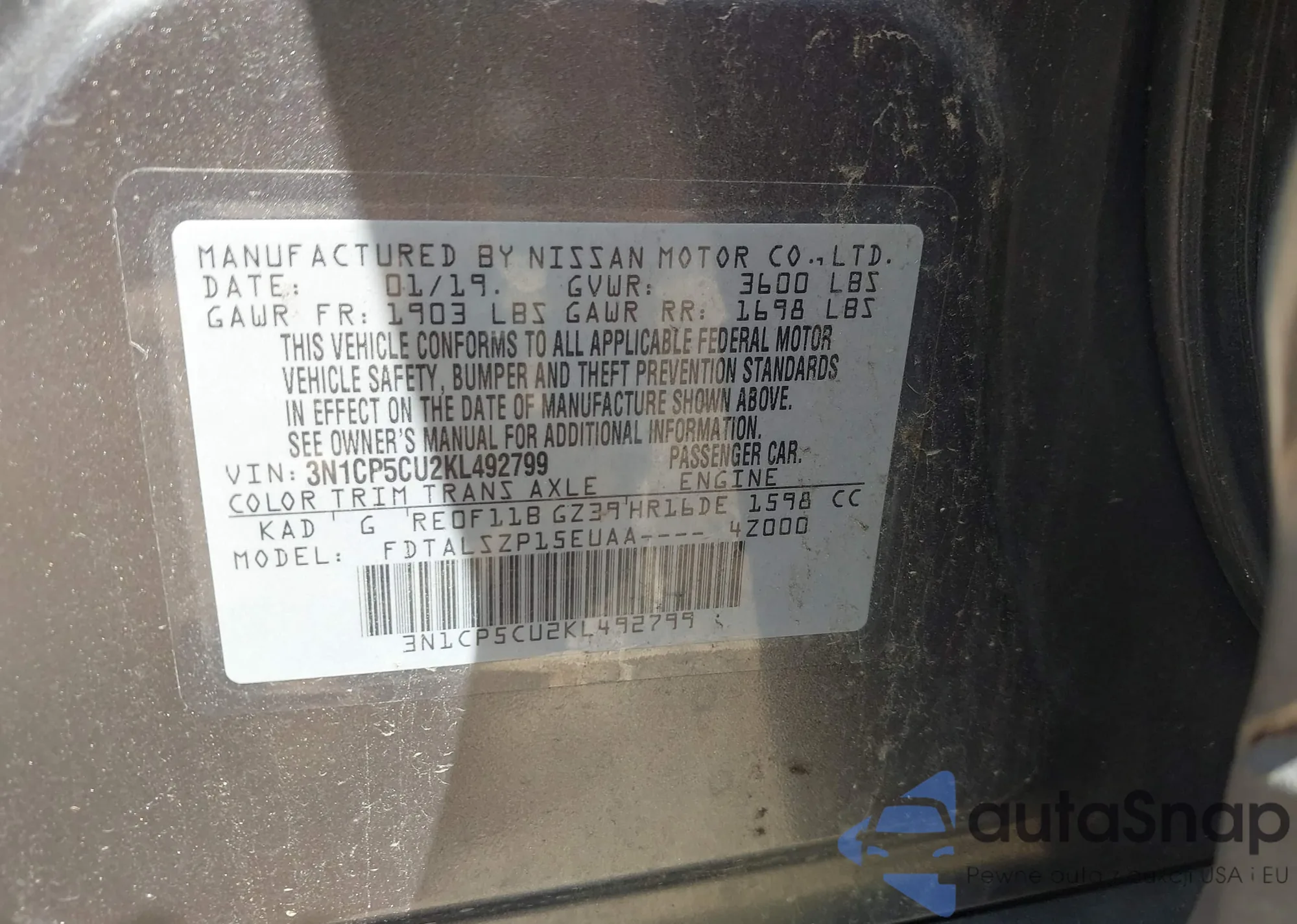 • VIN 4T1B11HK6KU687395