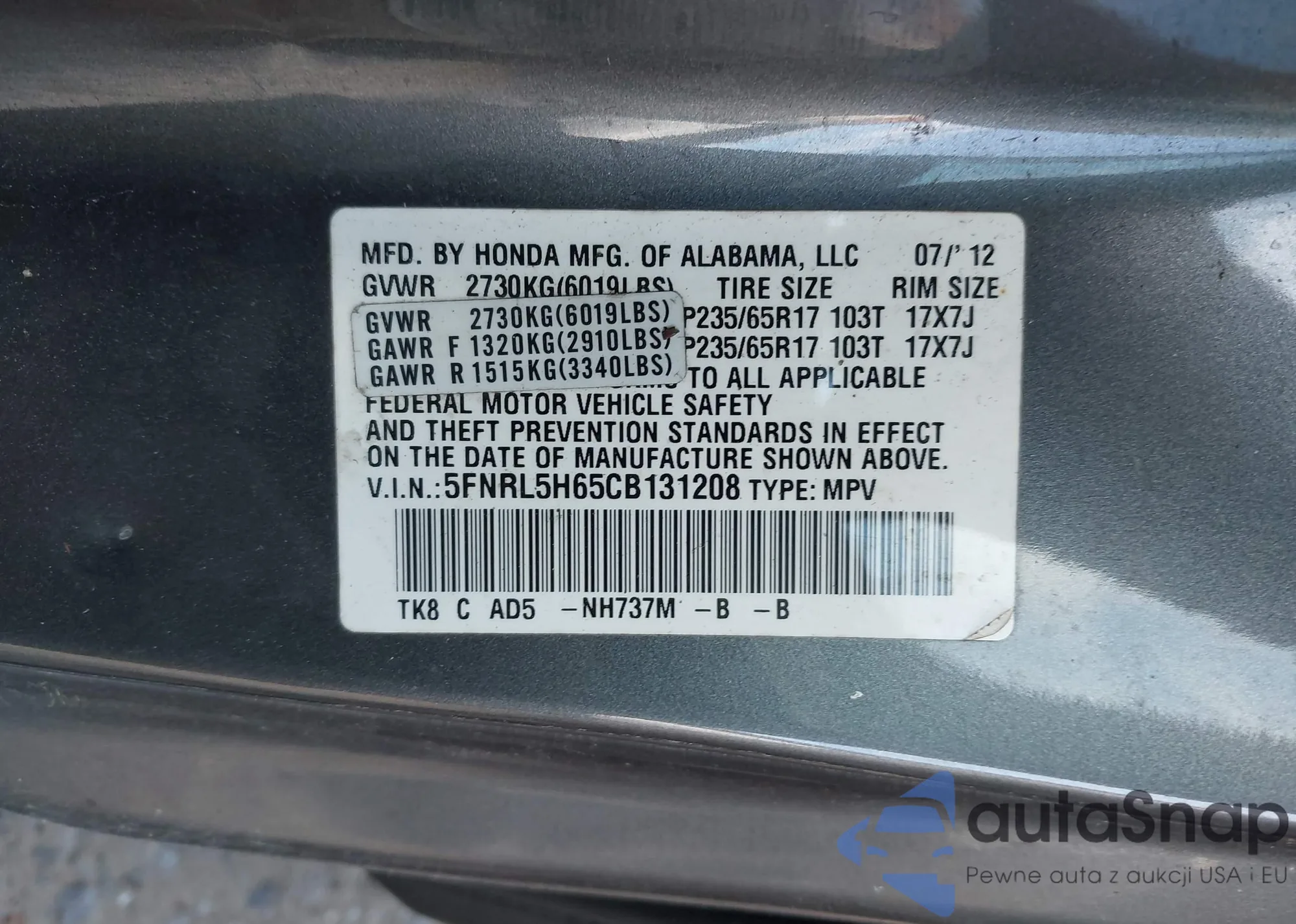 • VIN 5FNRL5H65CB131208