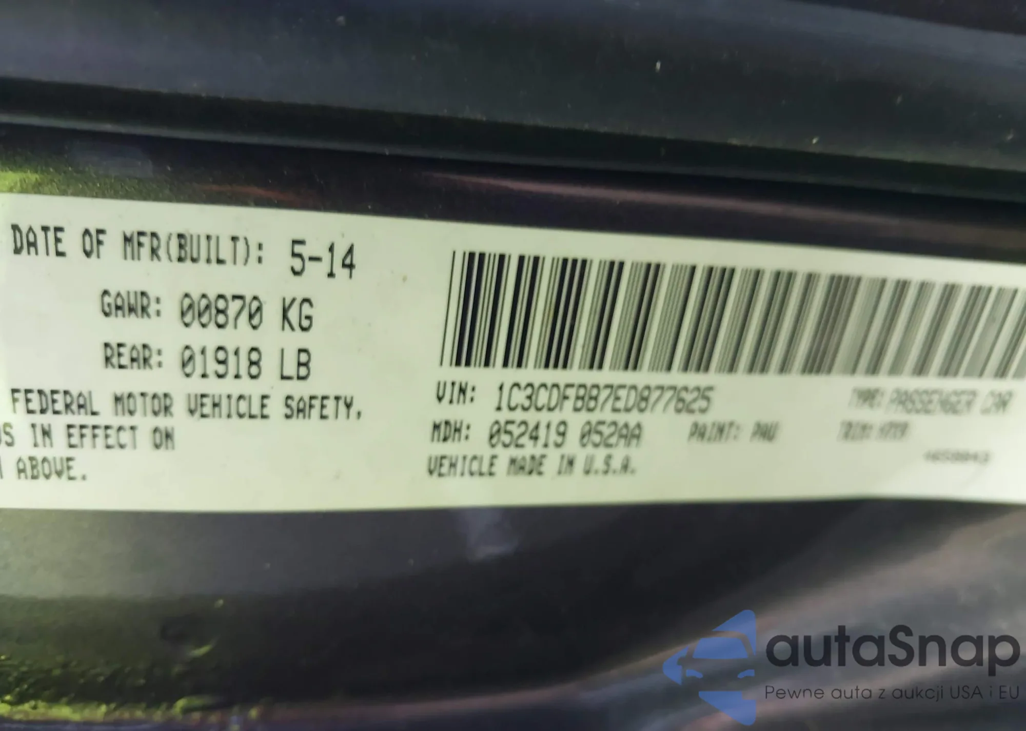 • VIN 1C3CDFBB7ED877625