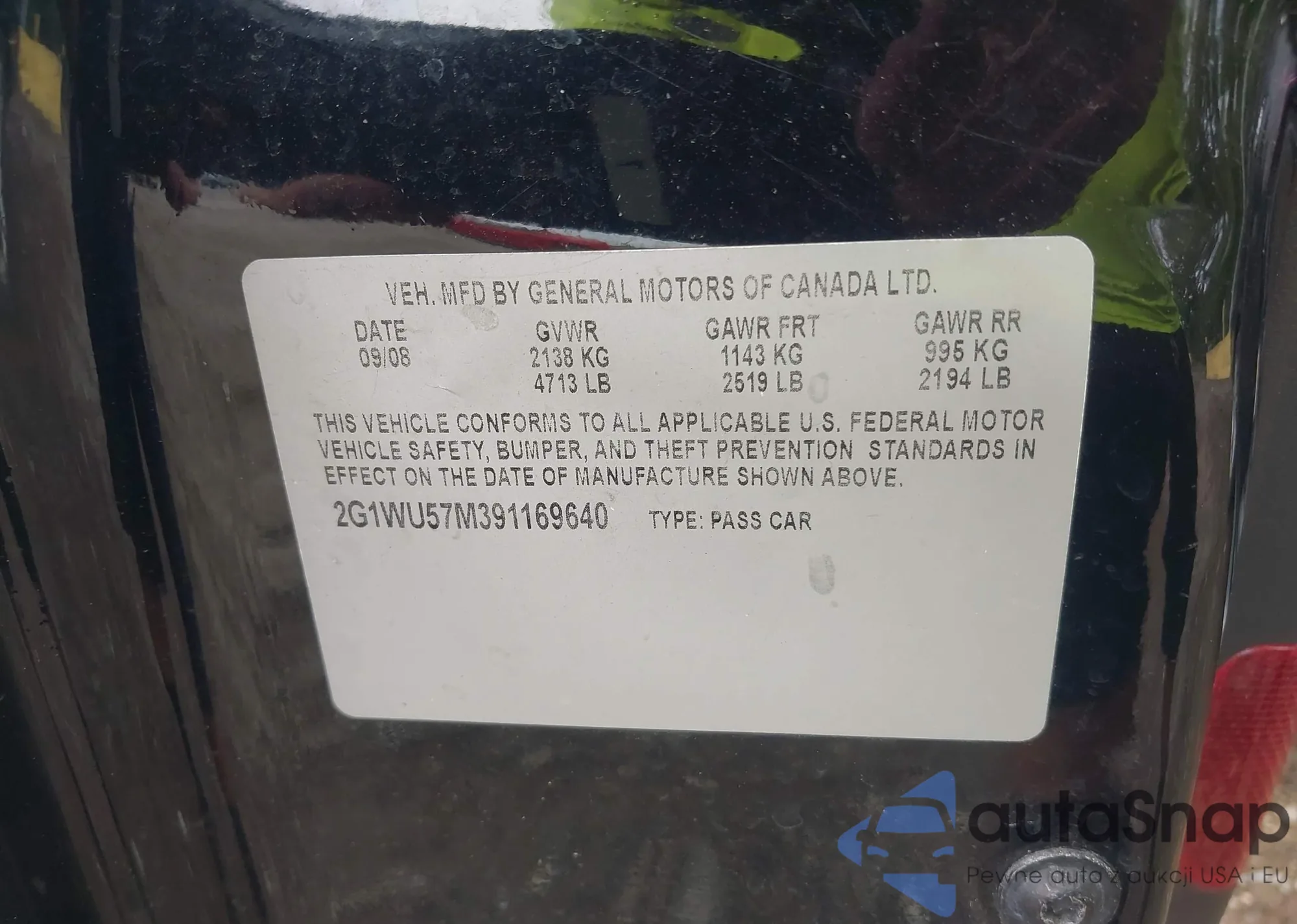 • VIN 2G1WU57M391169640