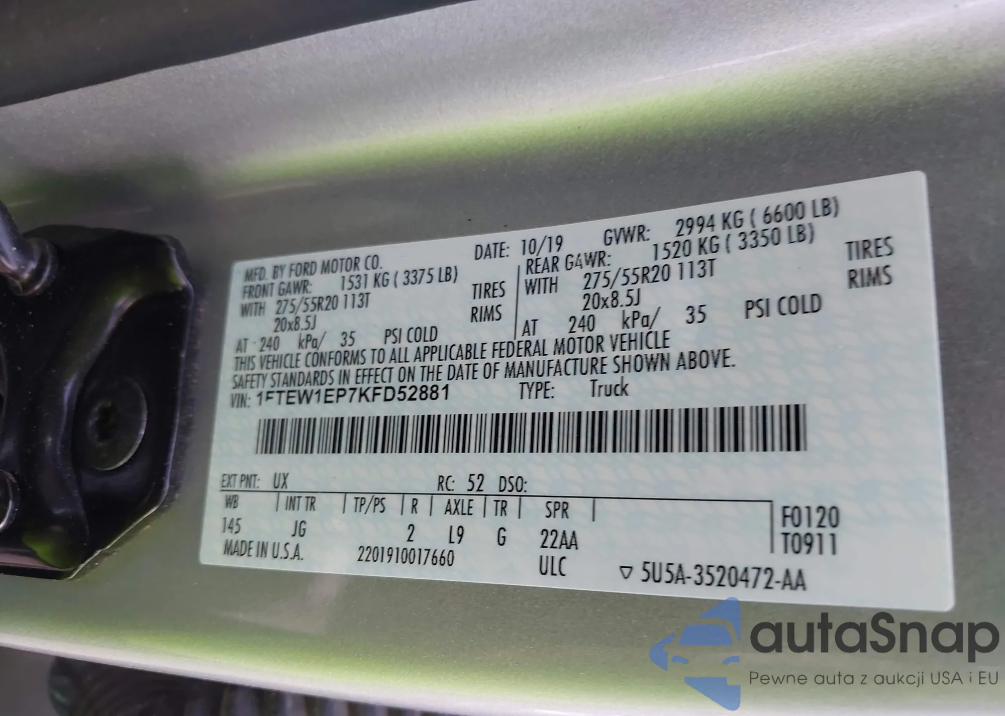 LOT: 43067612 VIN: 1FTEW1EP7KFD52881