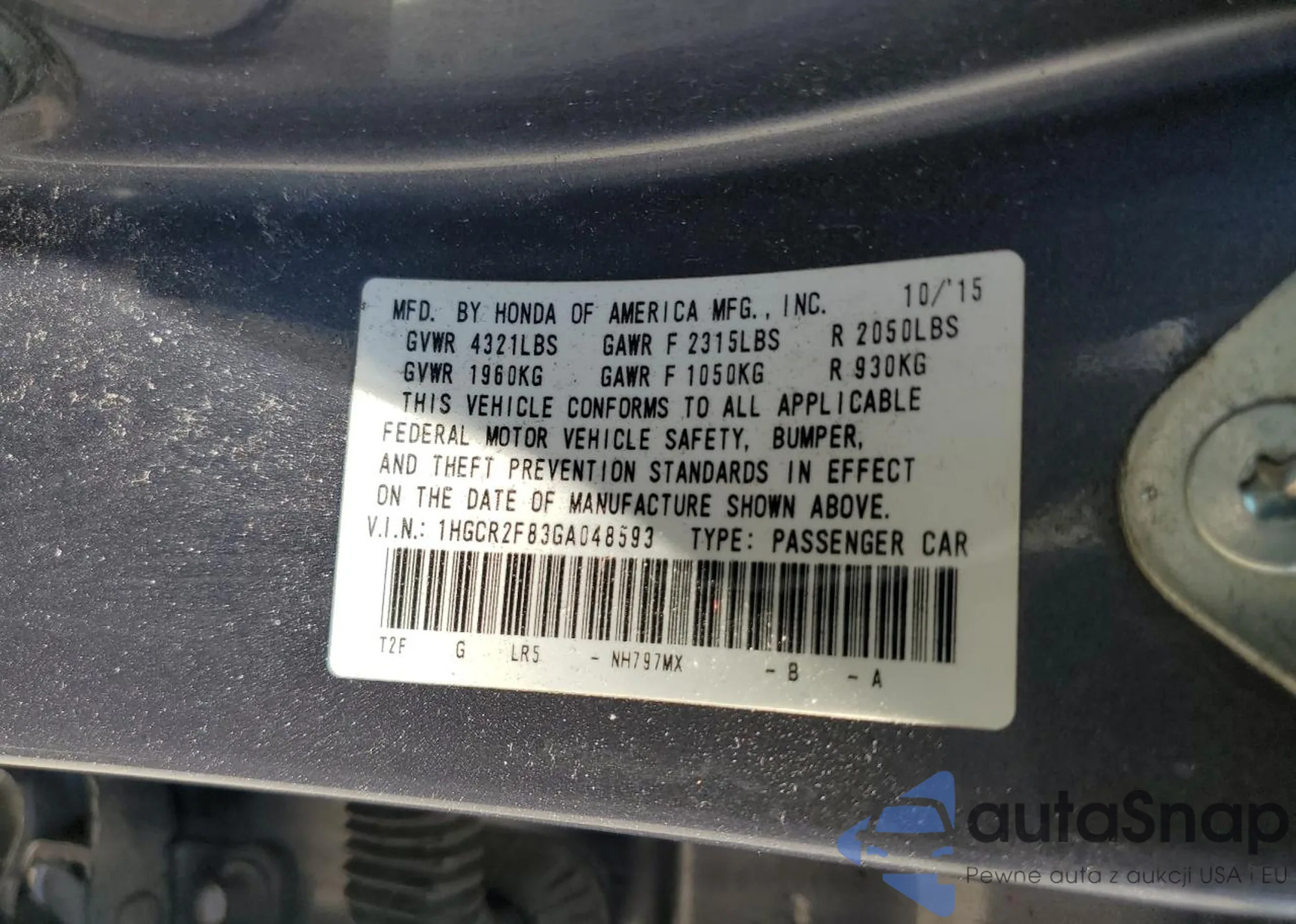 LOT: 64435365 VIN: 1HGCY1F25RA046274