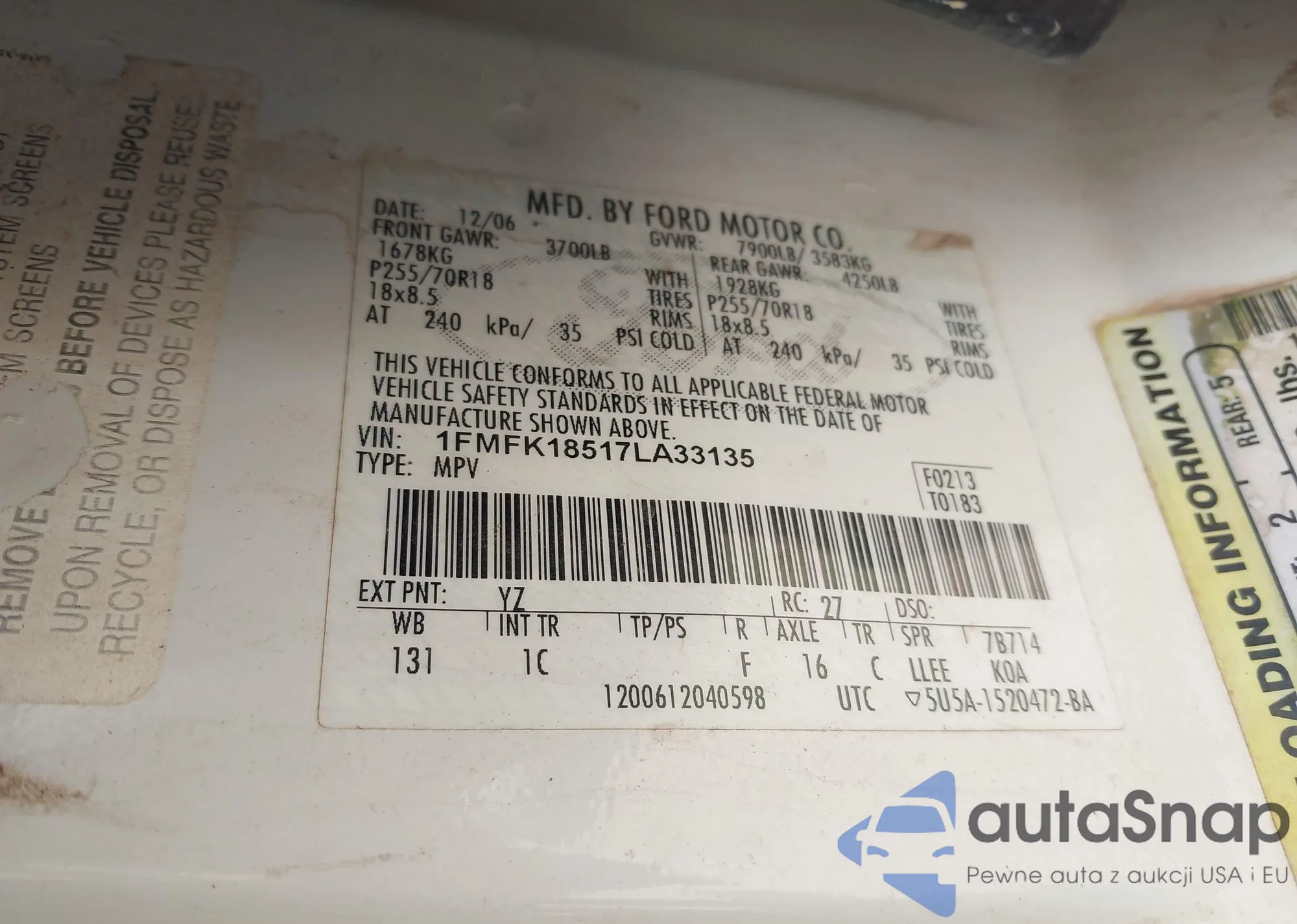 LOT: 43025780 VIN: 1FMFK18517LA33135