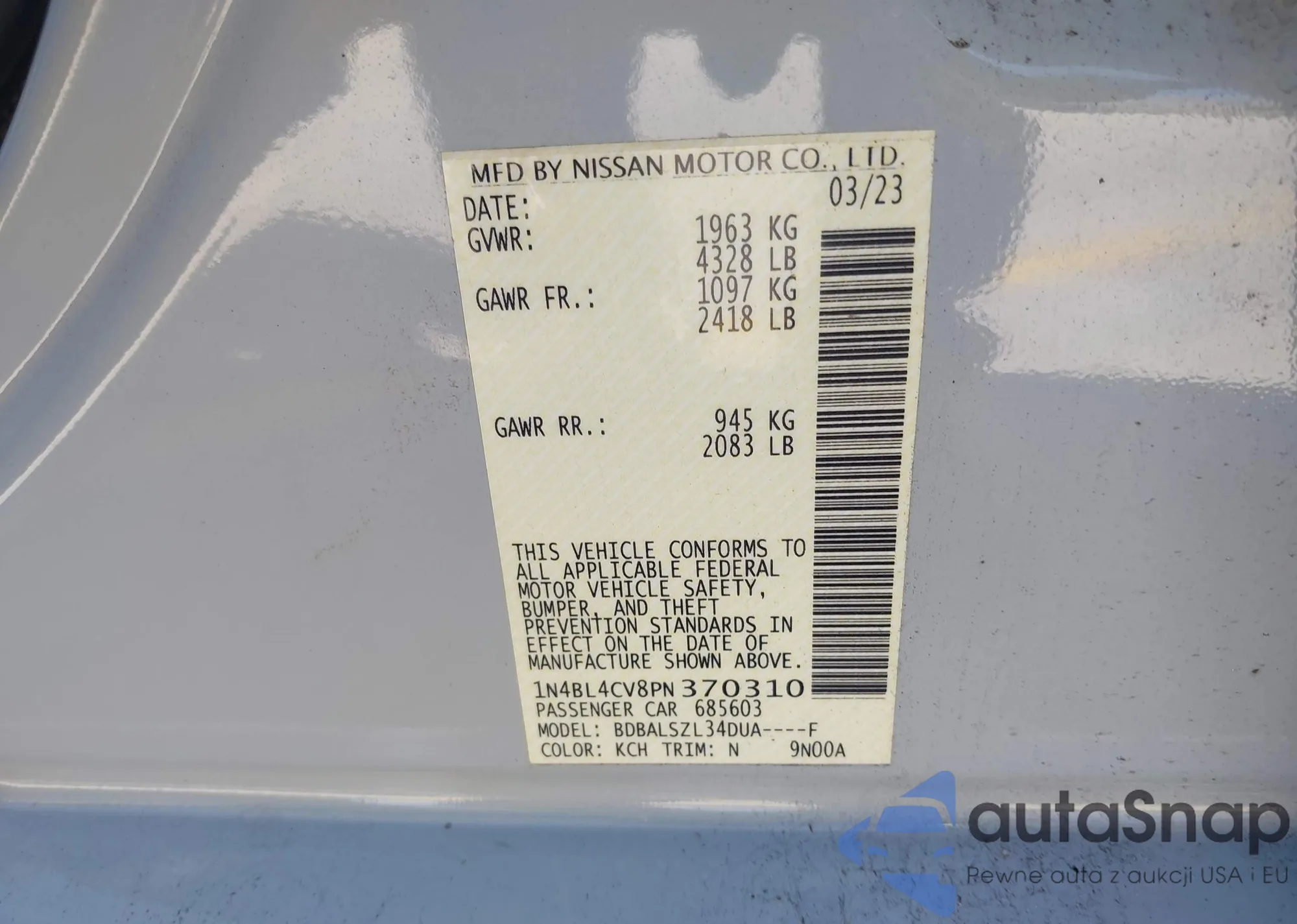 LOT: 40304110 VIN: 1N4BL4CV8PN370310