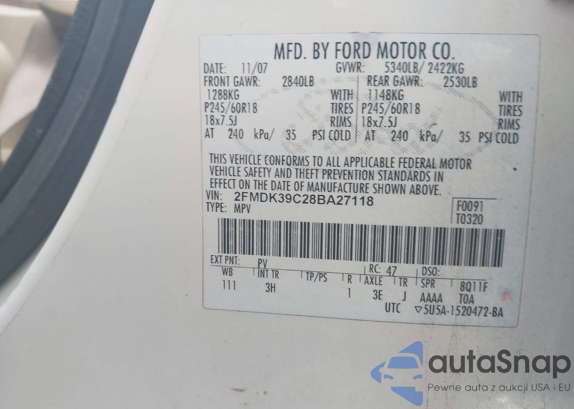 LOT: 42816789 VIN: 2FMPK3G98LBB19105