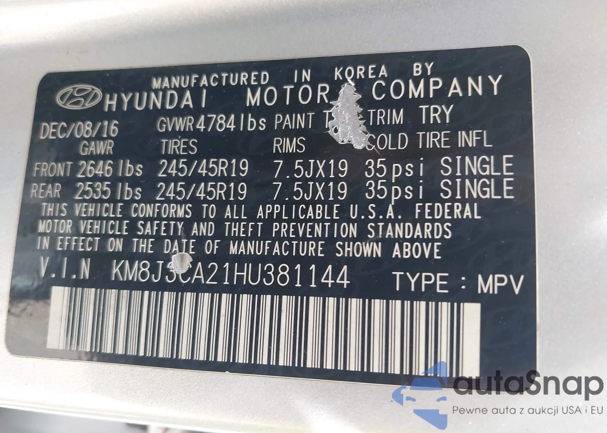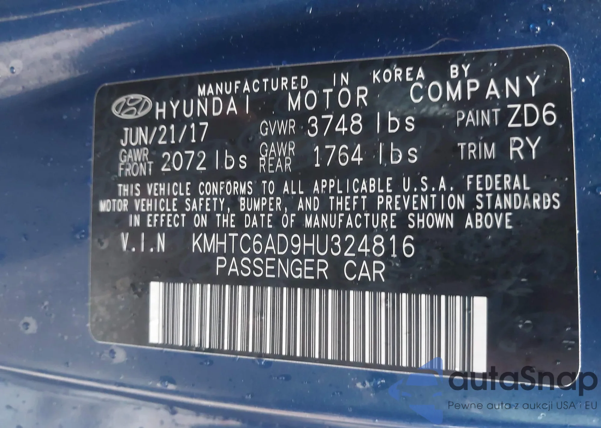 2017 Hyundai Veloster Value Edition from USA, damaged, VIN KMHTC6AD9HU324816