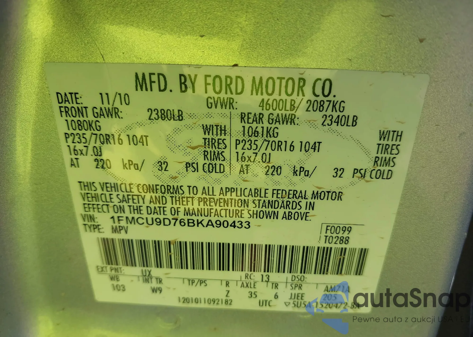 • VIN 1FMCU9D76BKA90433