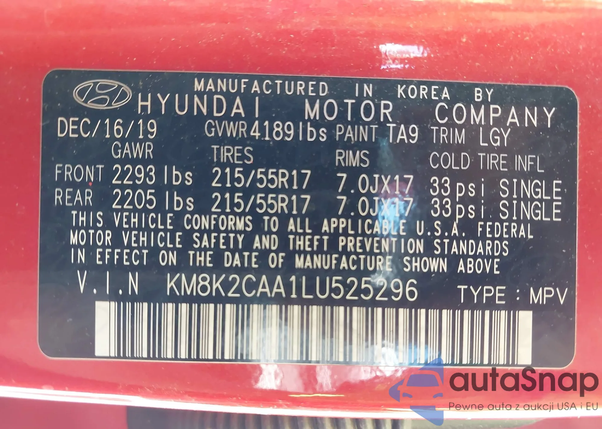 • VIN KM8K2CAA1LU525296