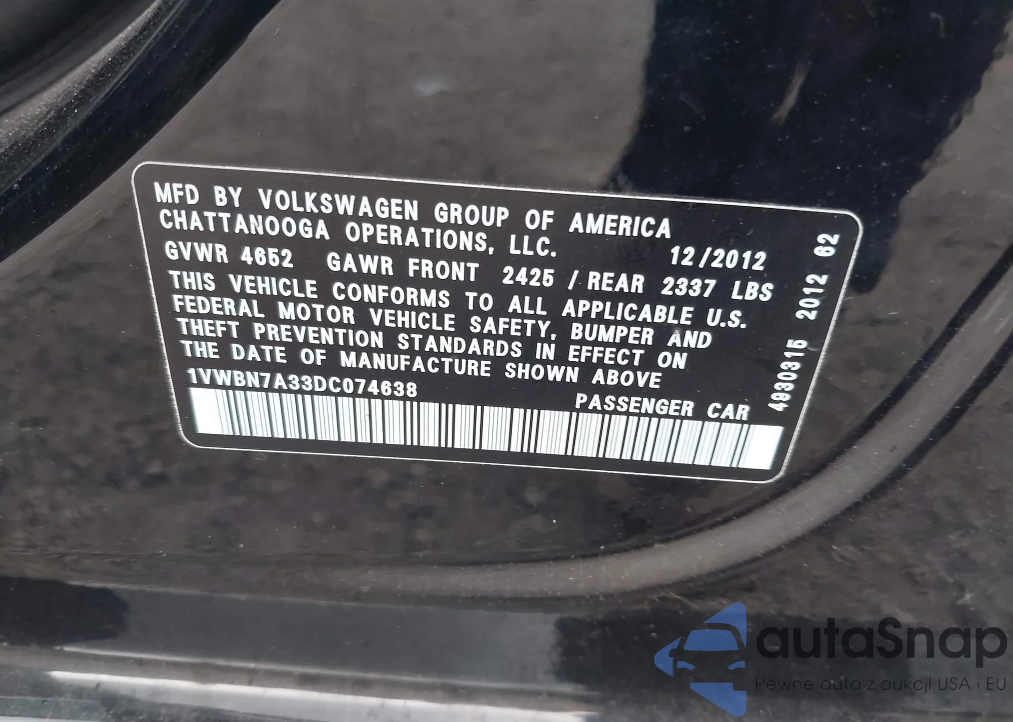 • VIN 1VWBN7A33DC074638