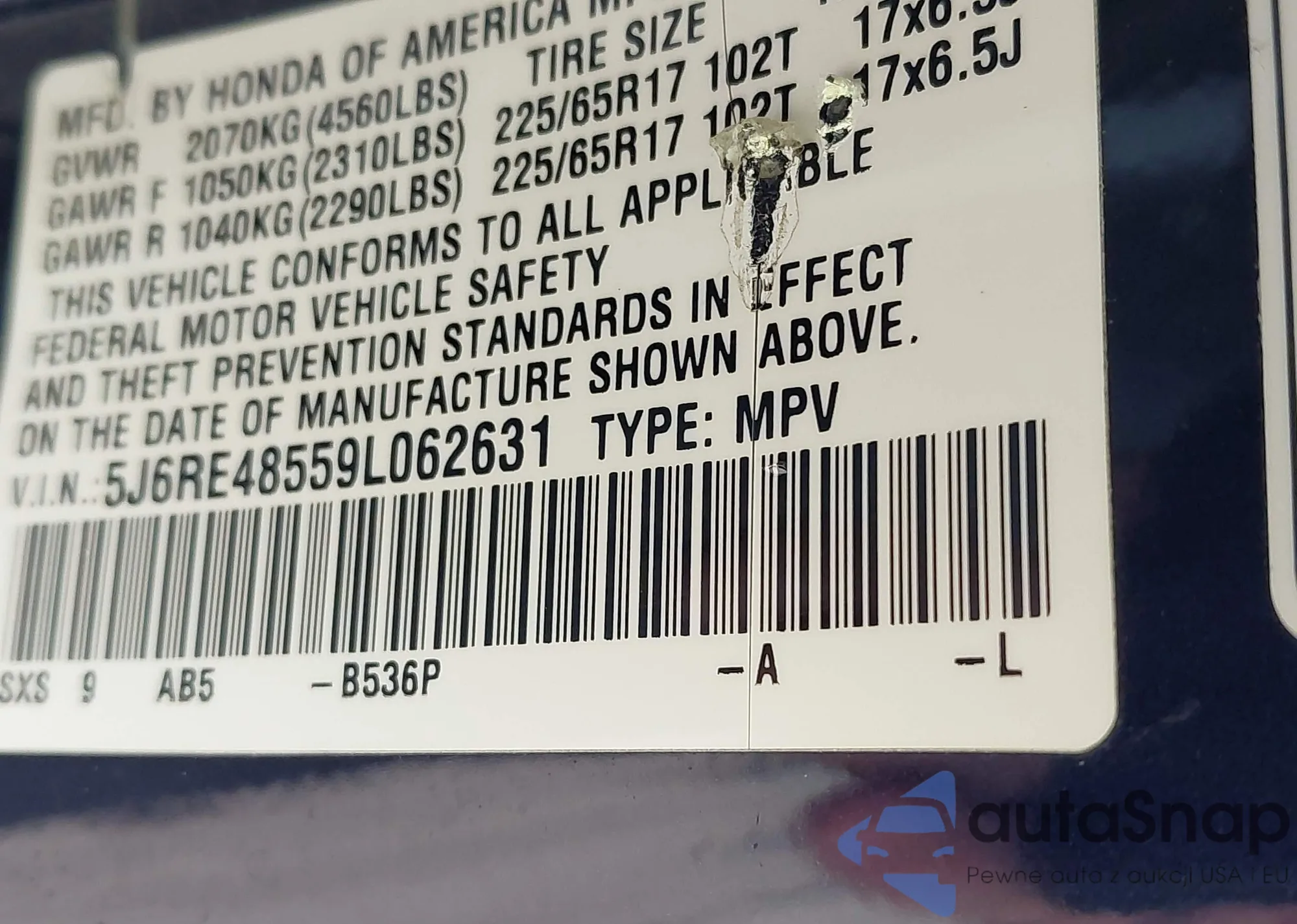 • VIN 5J6RE48559L062631