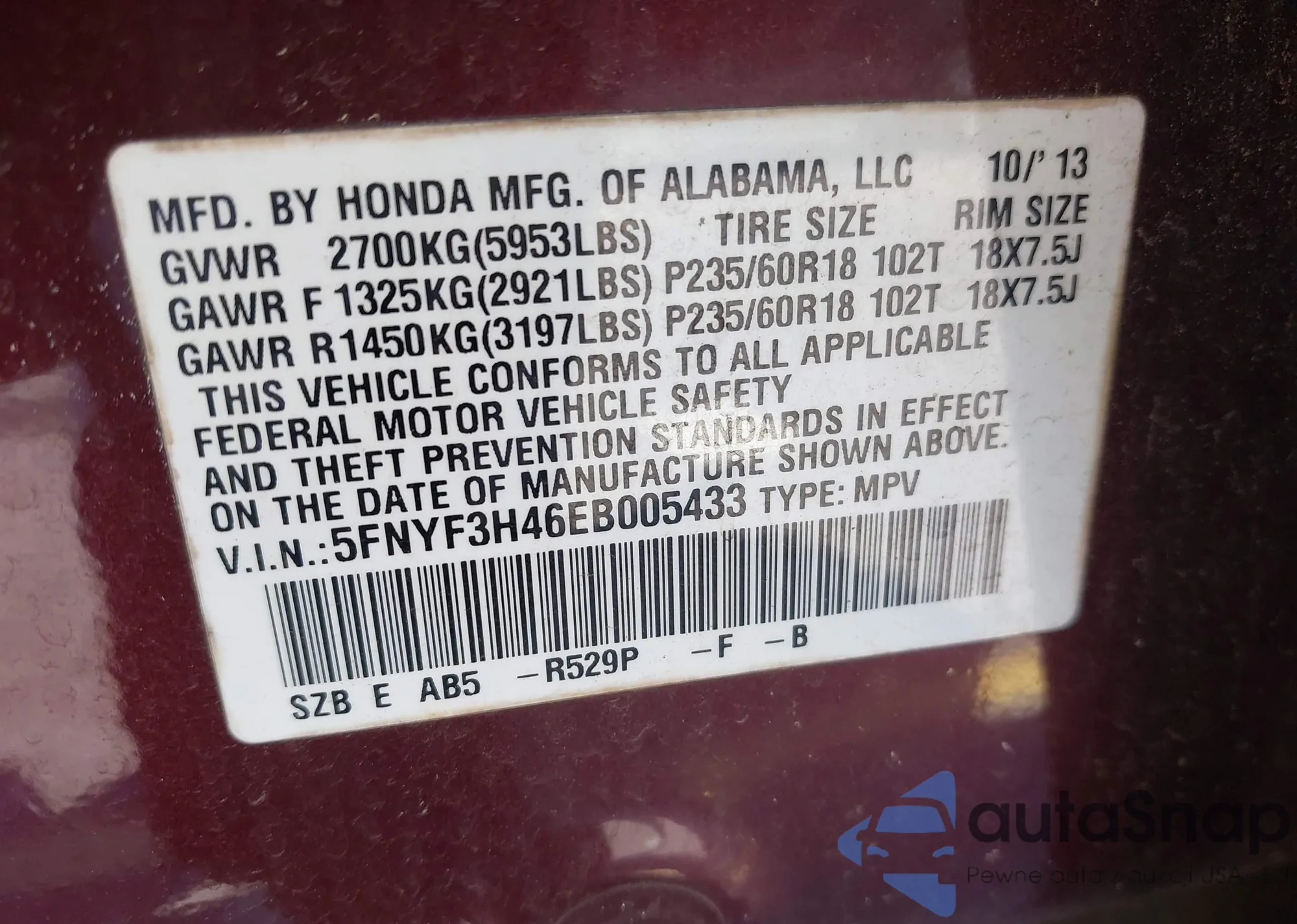 • VIN 5FNYF3H46E8005433