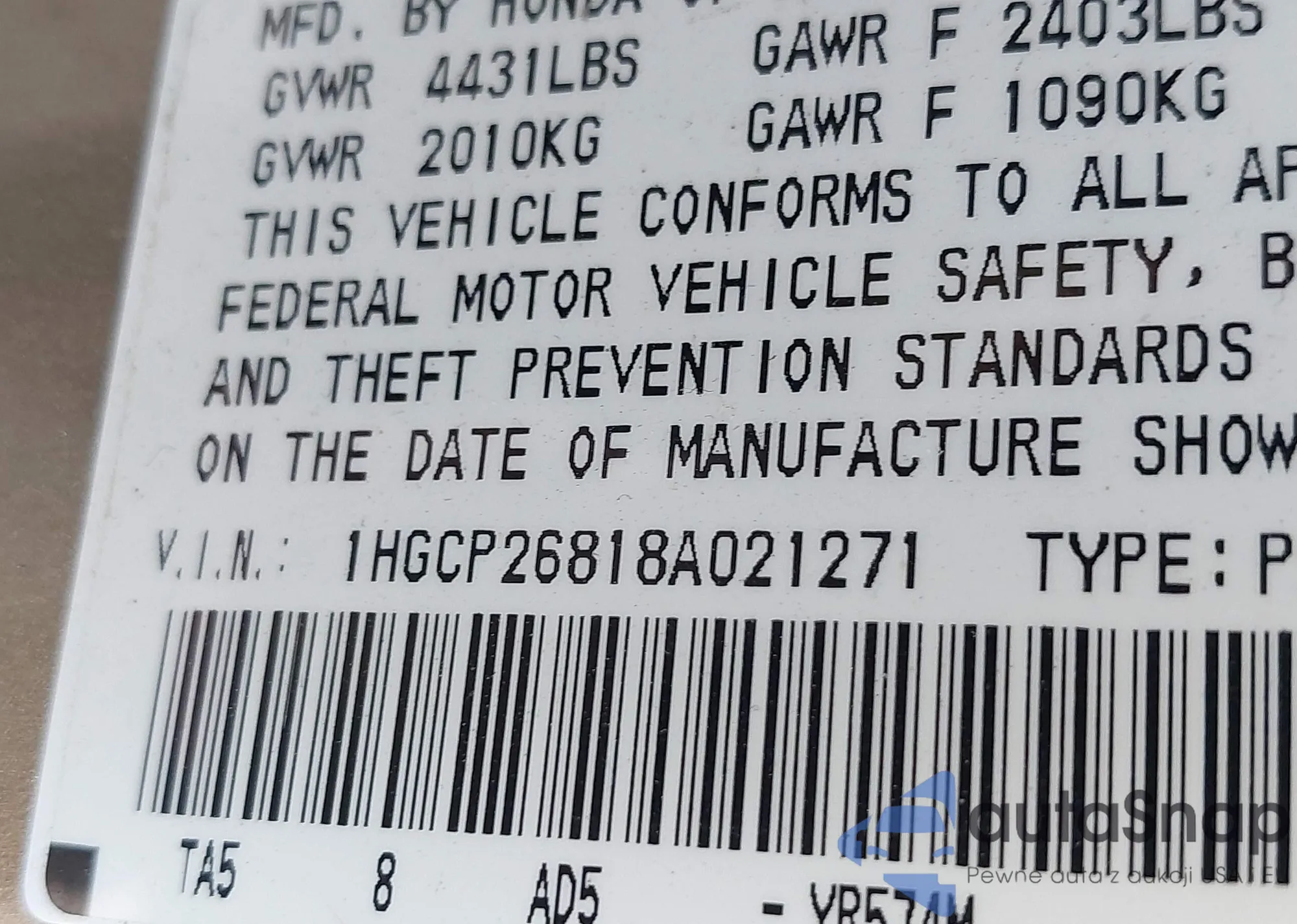 • VIN 1HGCP26818A021271