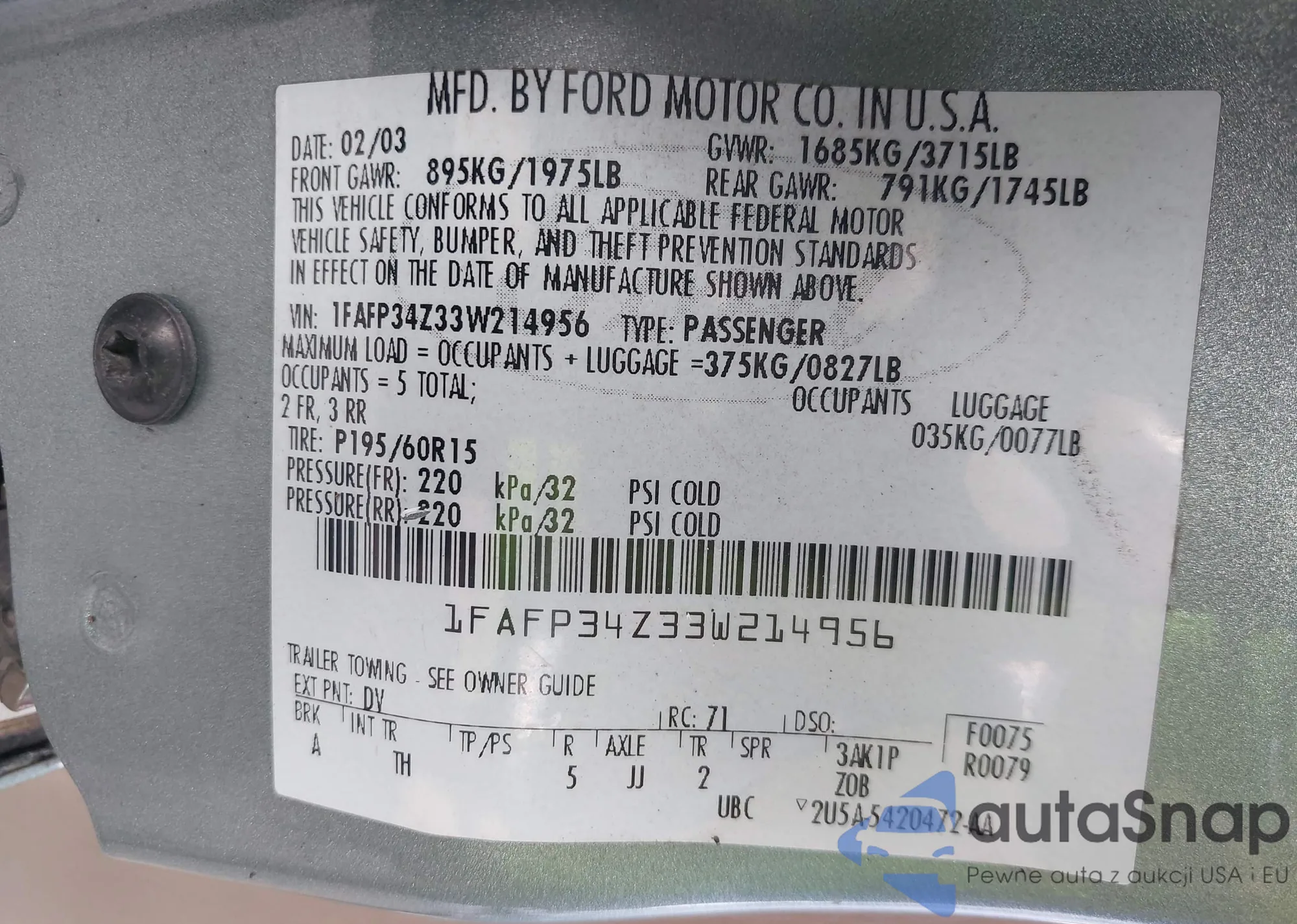 • VIN 1FAFP34Z33W214956