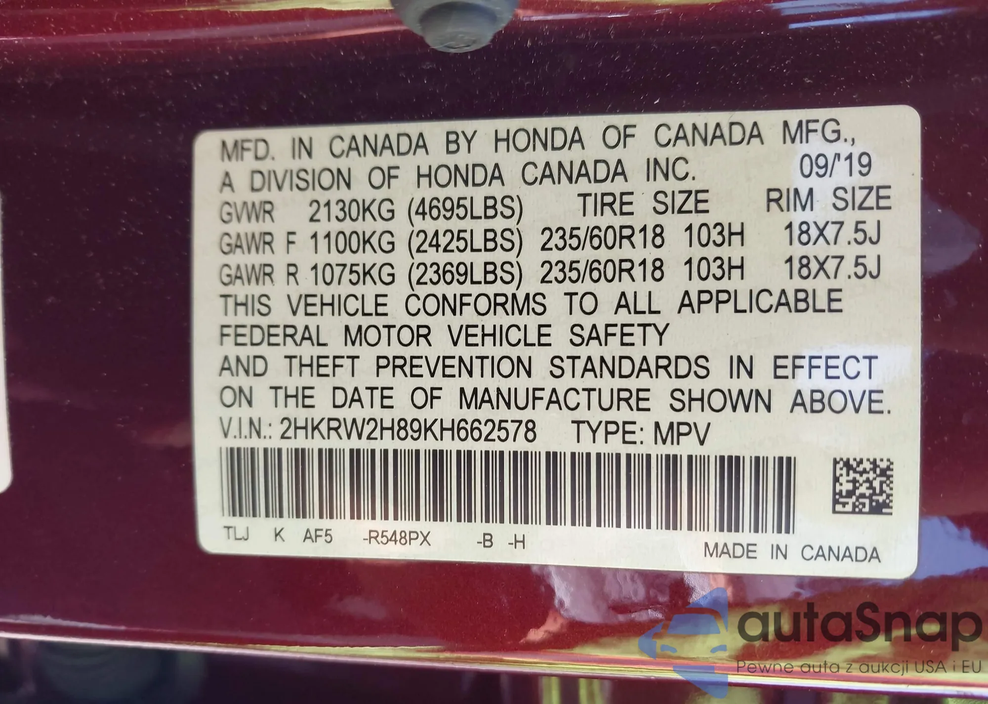 • VIN 2HKRW2H89KH662578