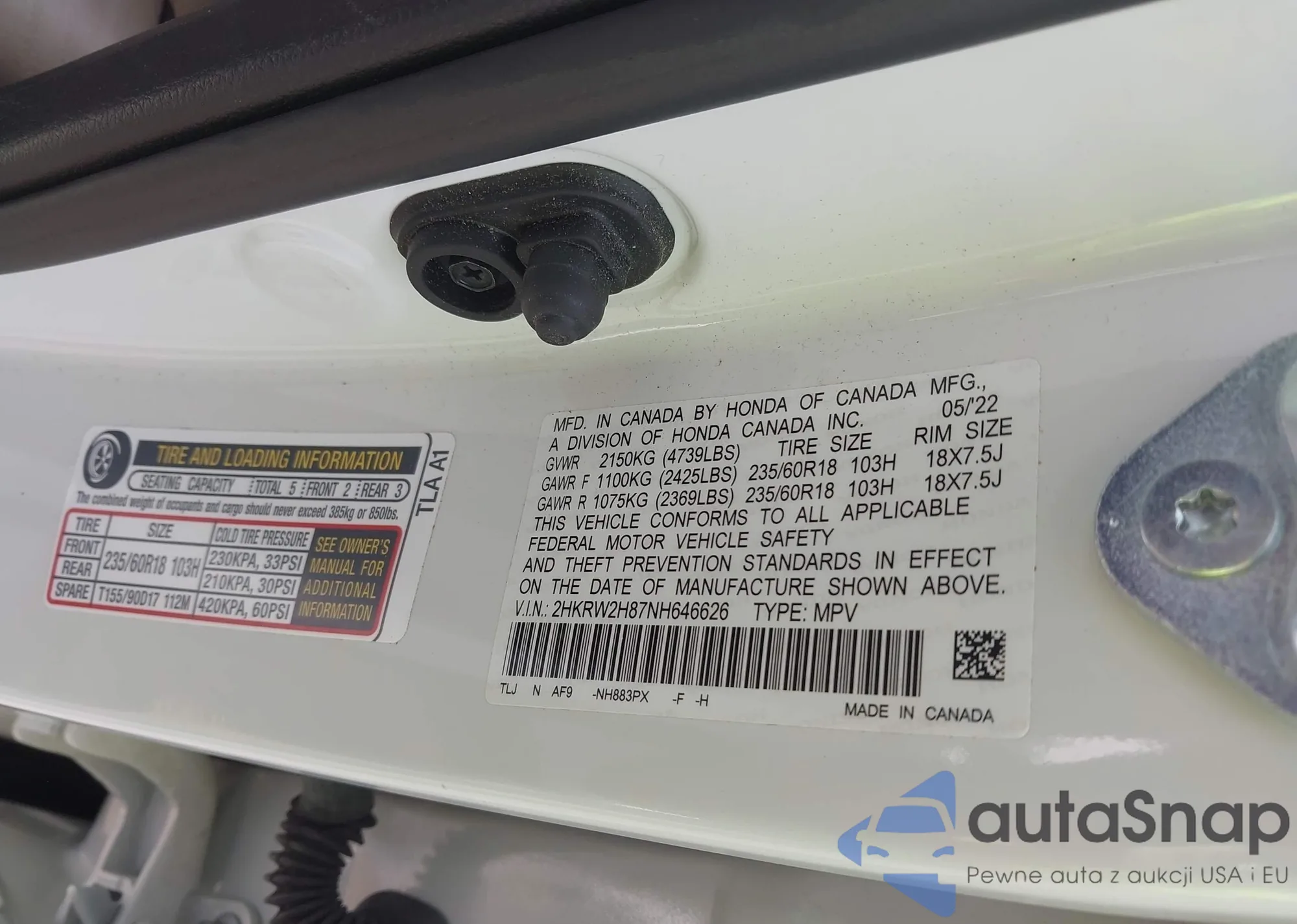 • VIN 2HKRW2H87NH646626