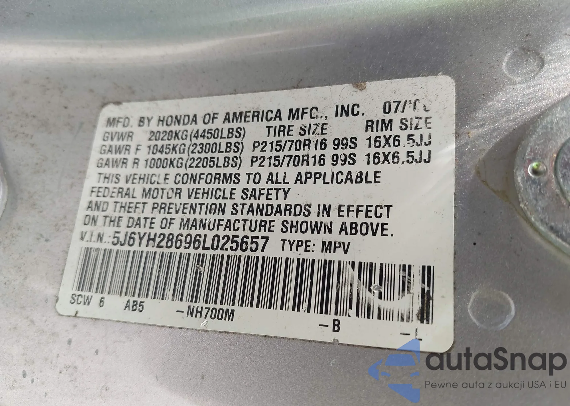• VIN 5J6YH28696L025657