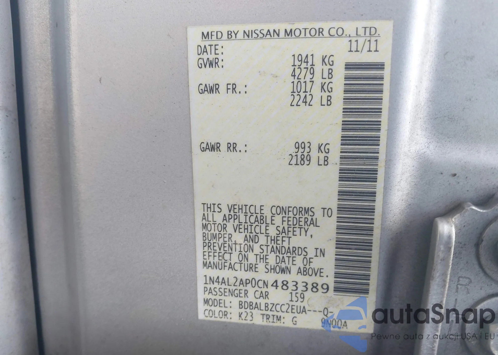 LOT: 42803824 VIN: 19UUA65594A049513