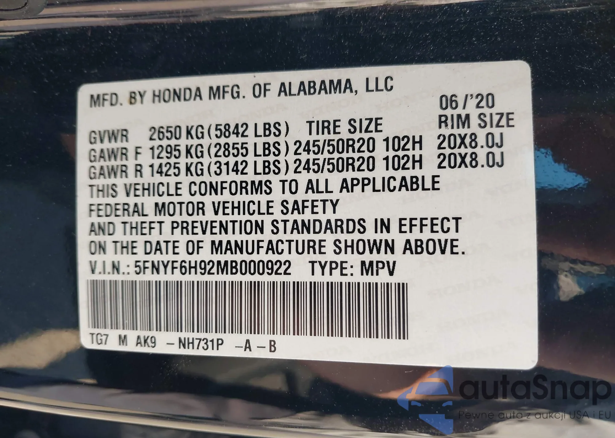 • VIN 5FNYF6H92MB000922