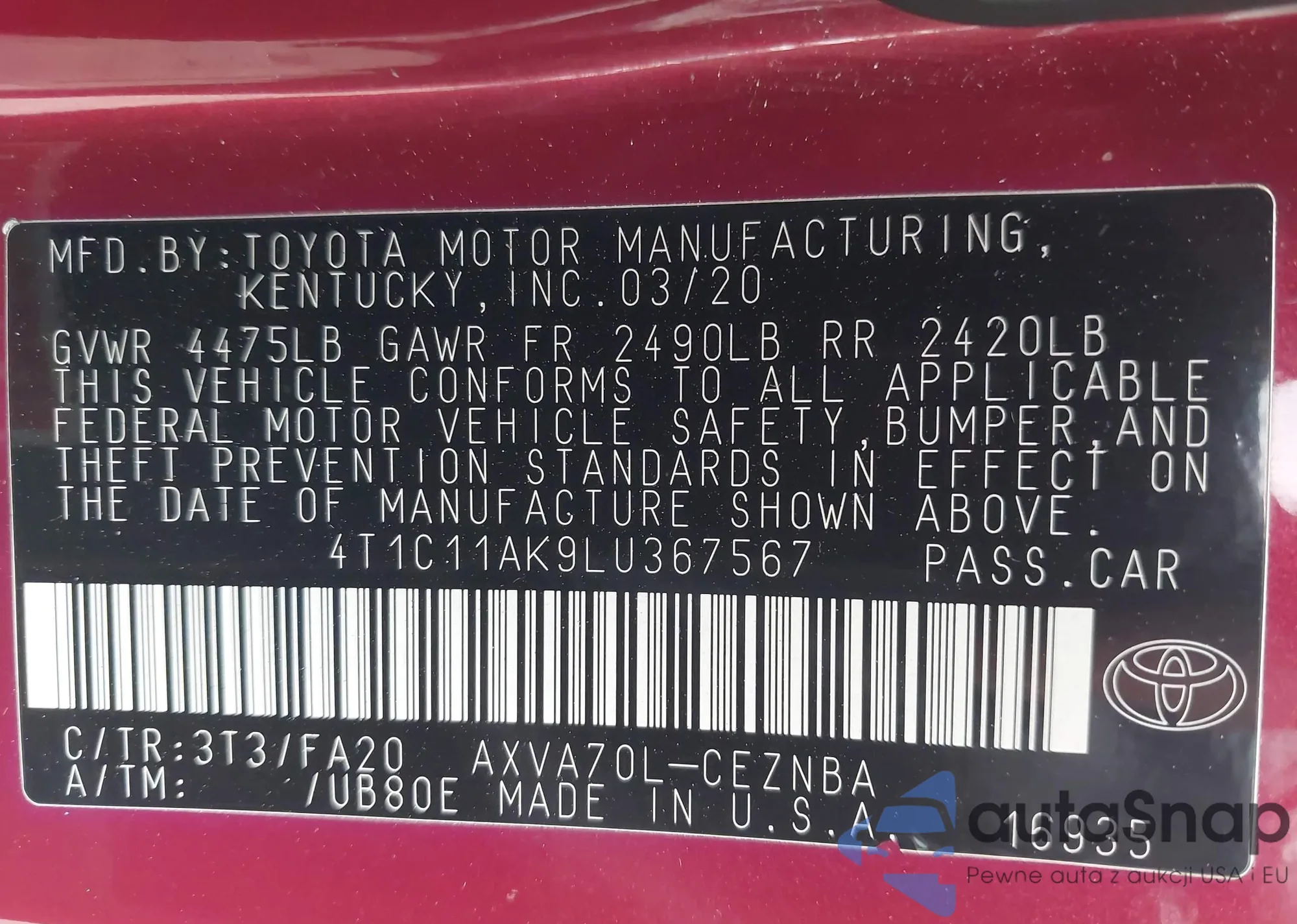LOT: 42173586 VIN: 4T1C11AK9LU367567