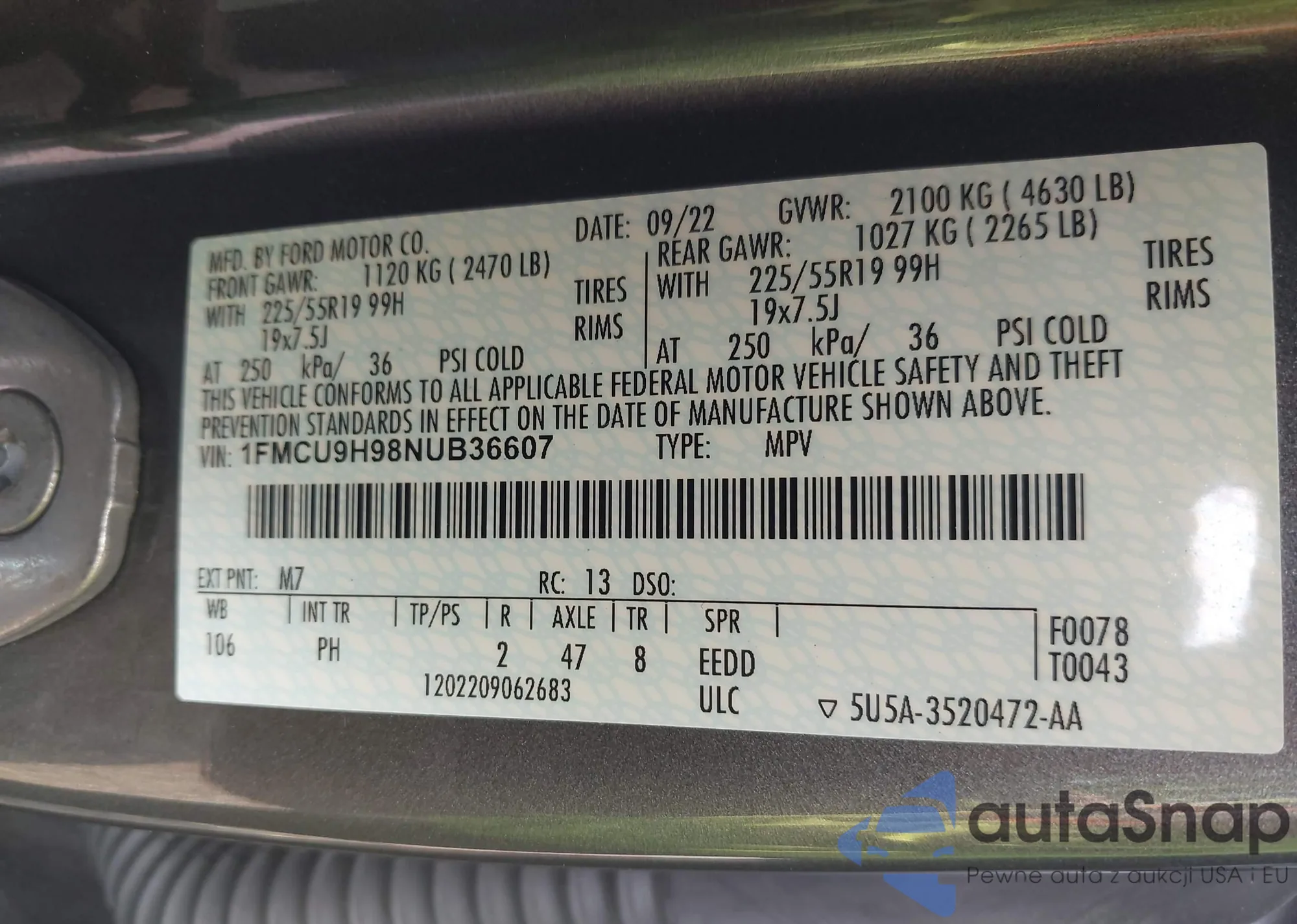 • VIN 1FMCU9H98NUB36607