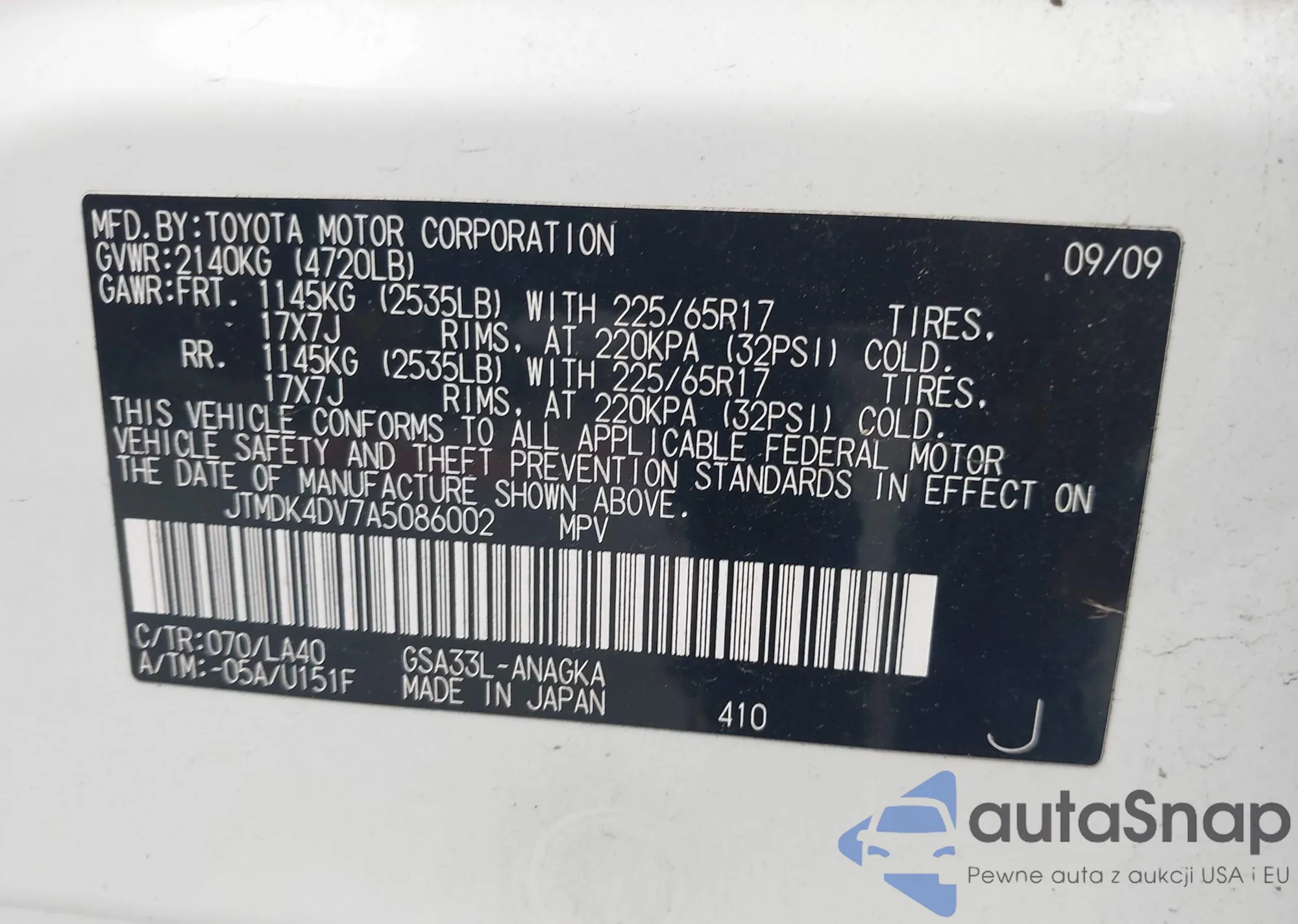 LOT: 43018605 VIN: JTMDK4DV7A5086002