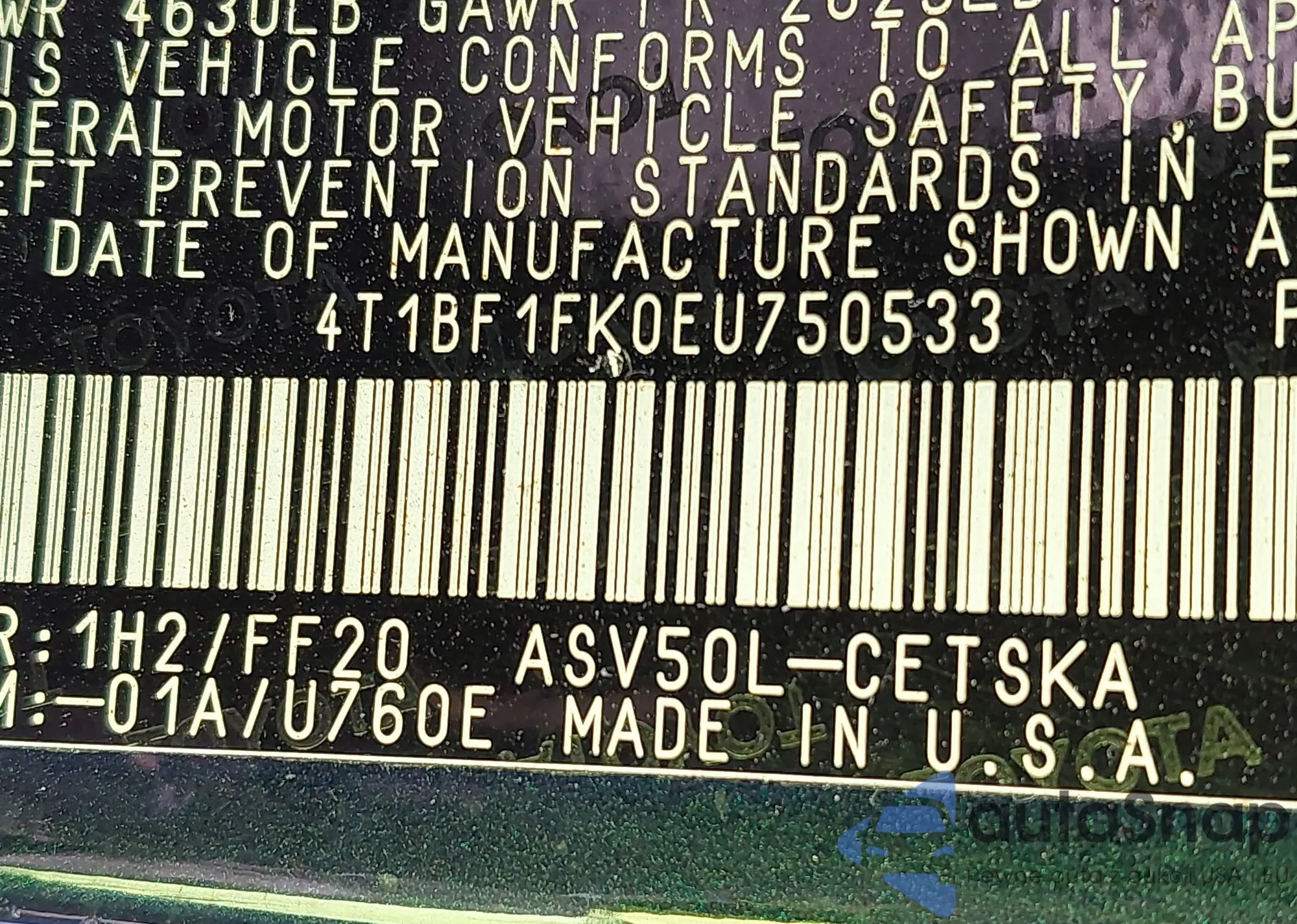 • VIN 4T1BF1FK0EU750533