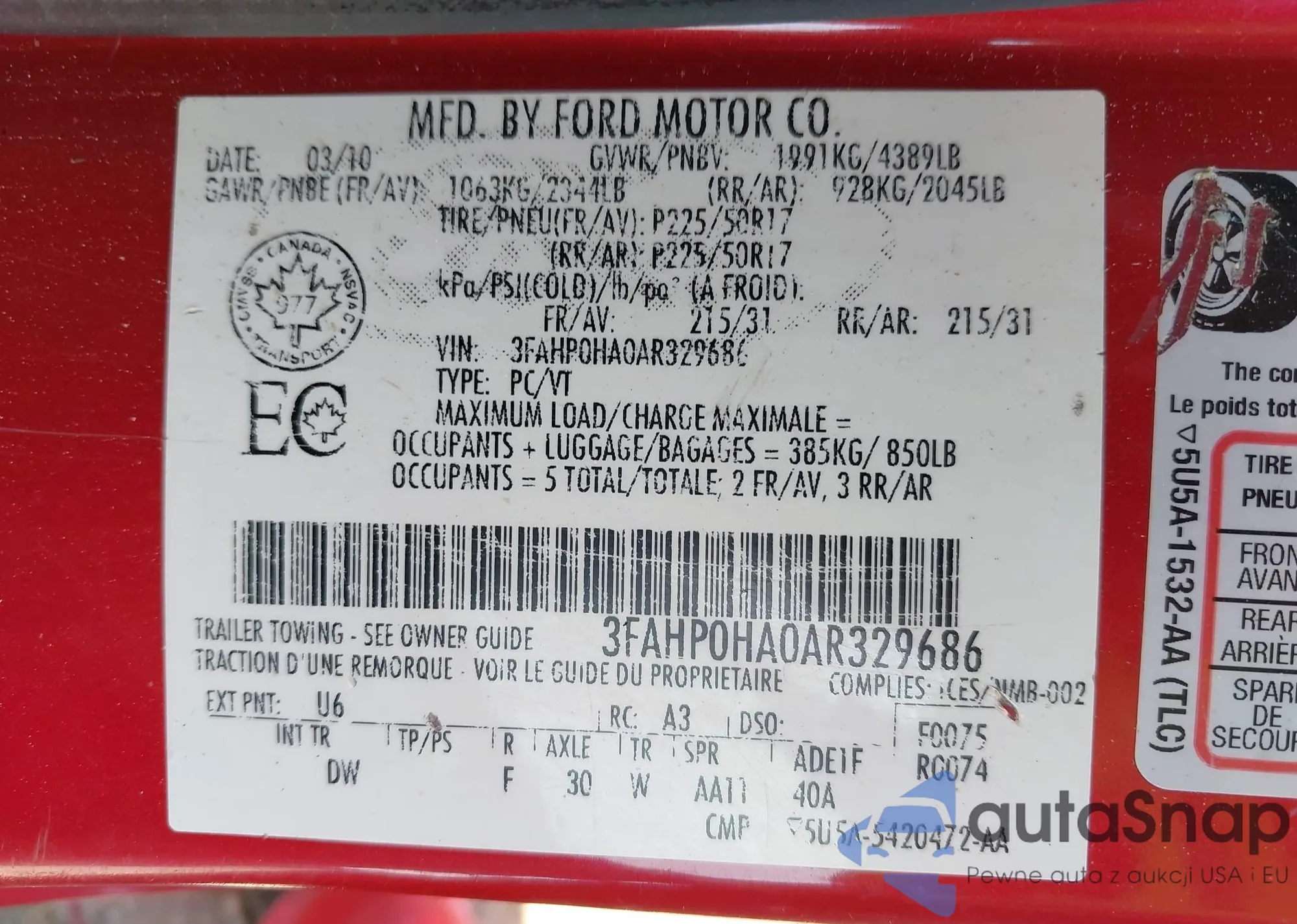 • VIN 3FAHP0HA0AR329686