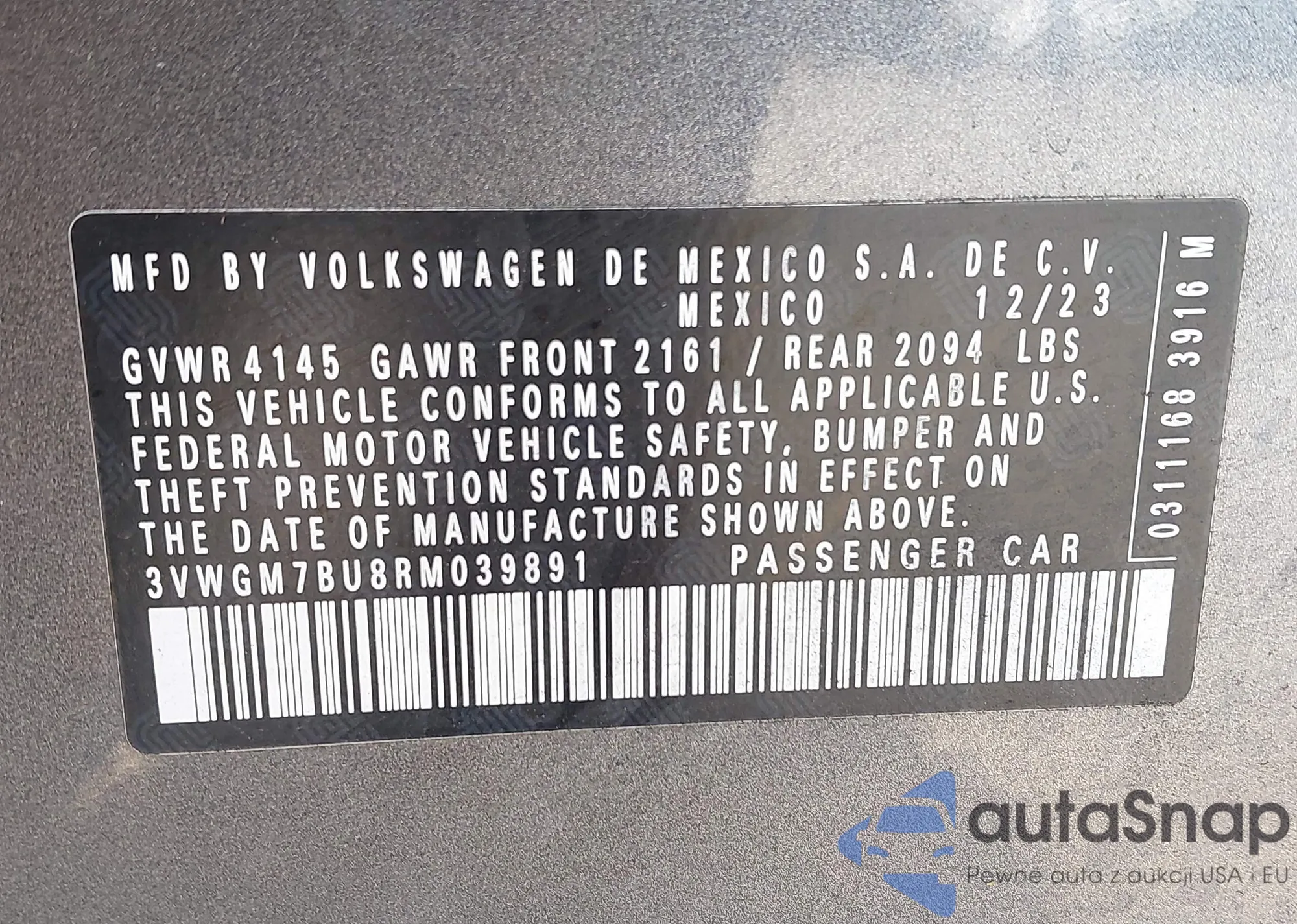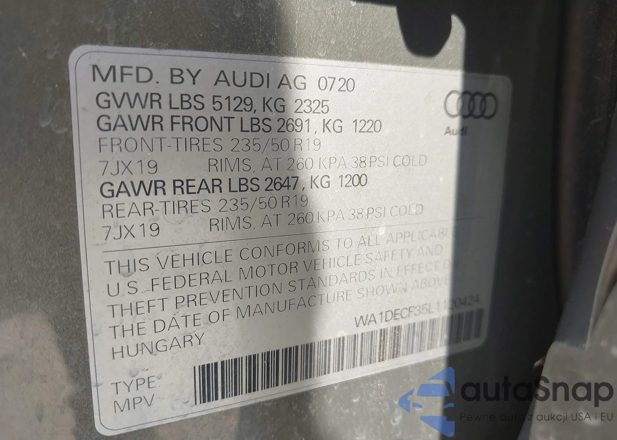 LOT: 42943322 VIN: WA1DECF35L1120424