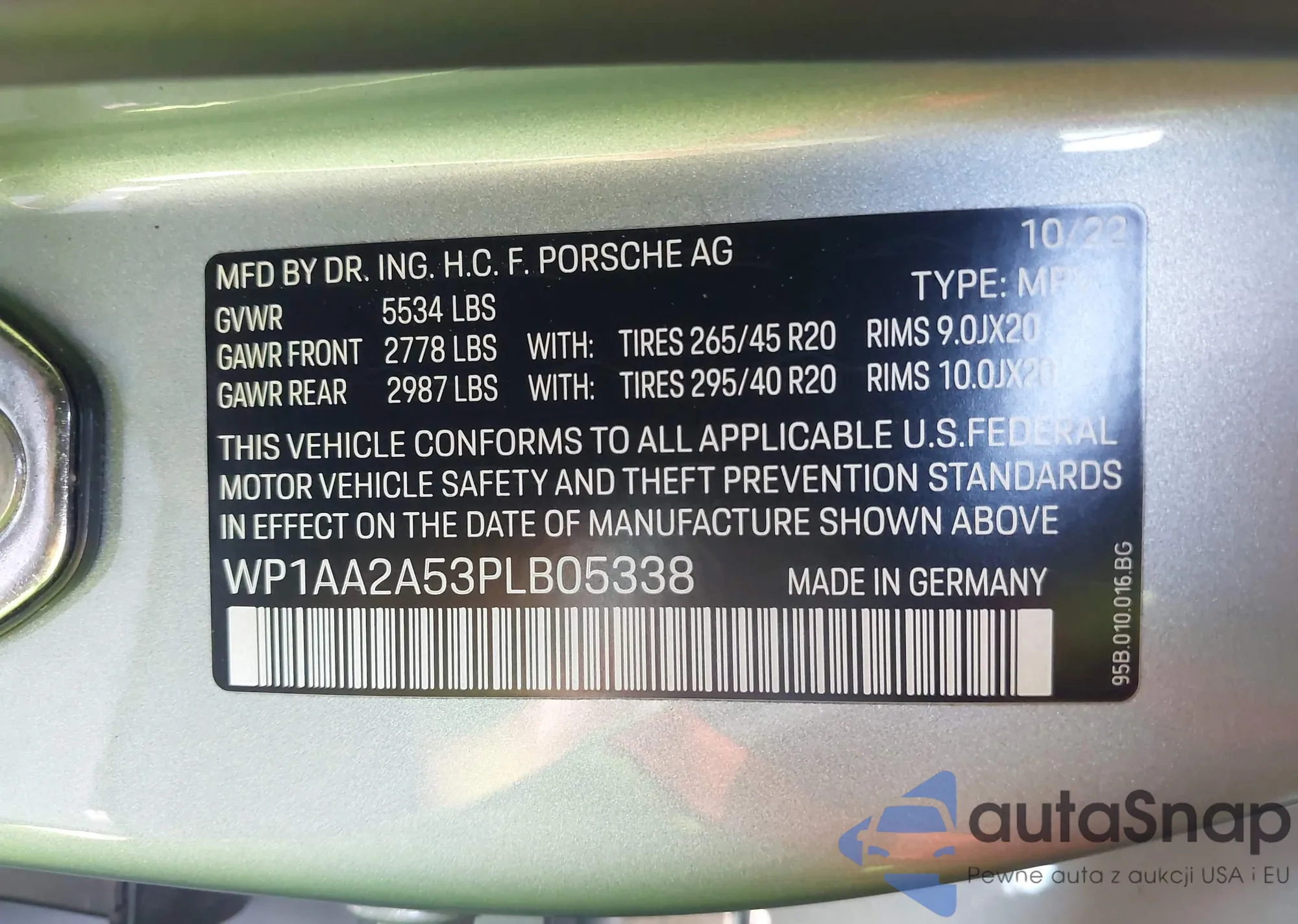LOT: 43040985 VIN: WP1AA2A53PLB05338