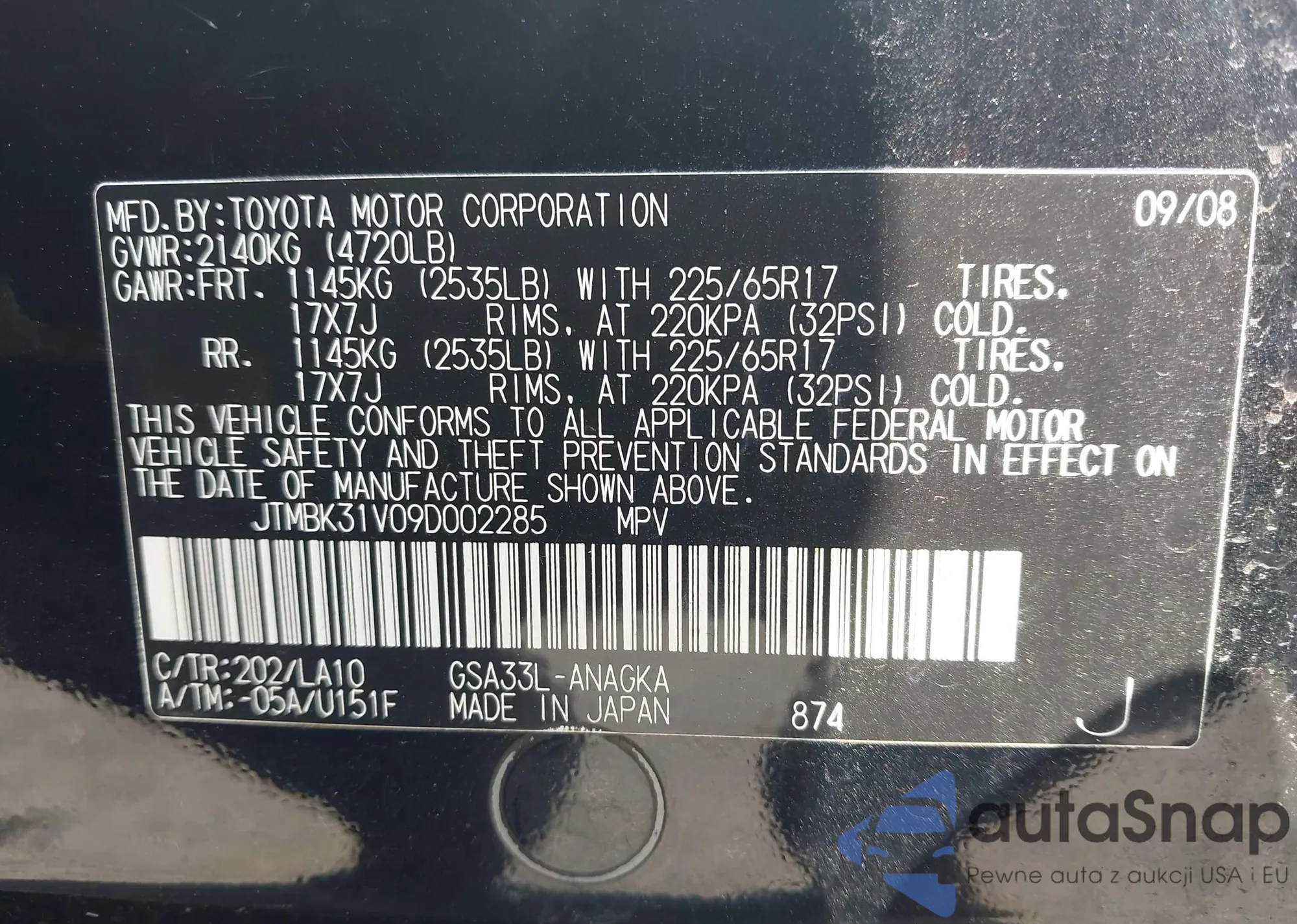 LOT: 42846753 VIN: JTMBK31V09D002285