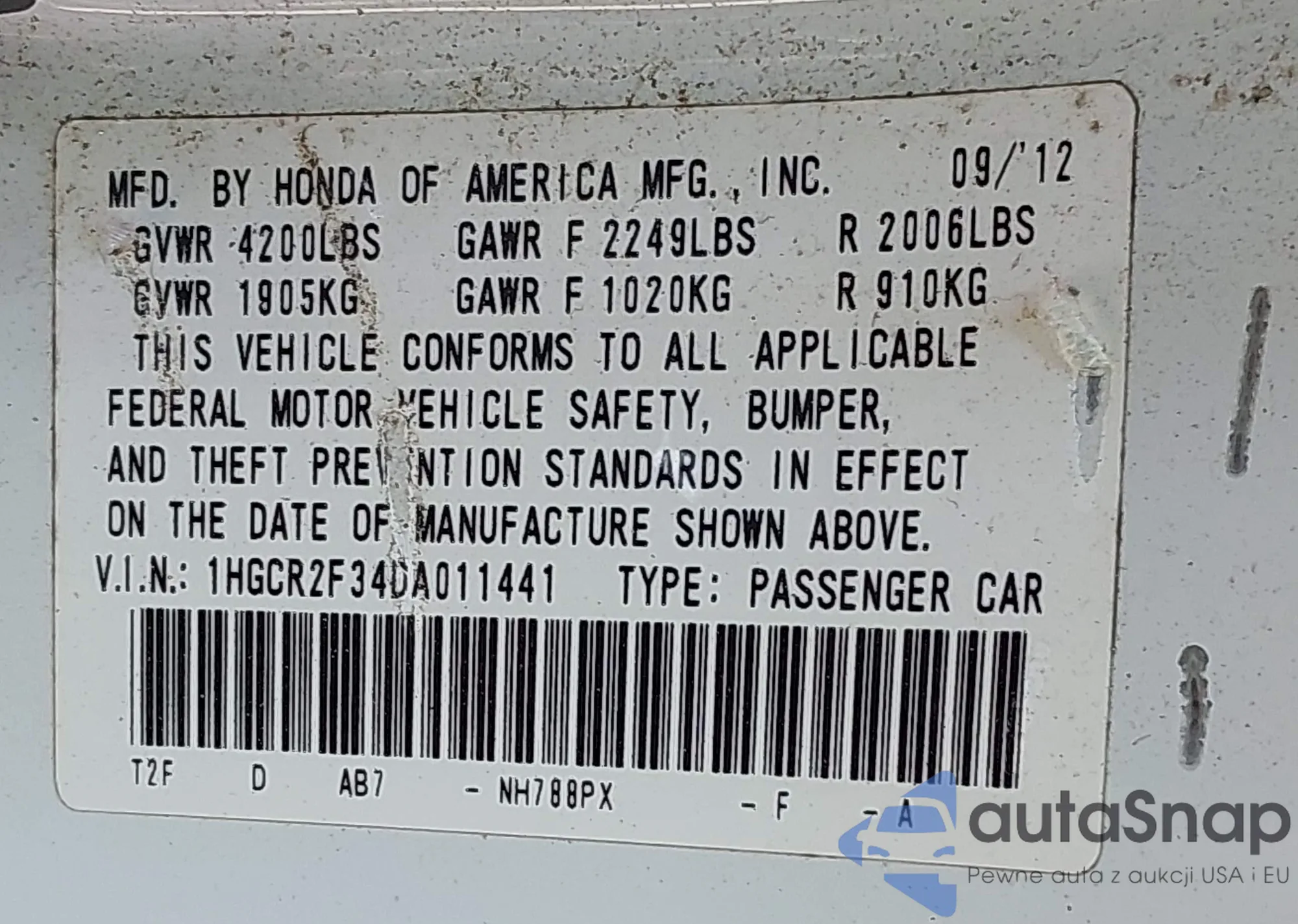 • VIN 1HGCR2F34DA011441