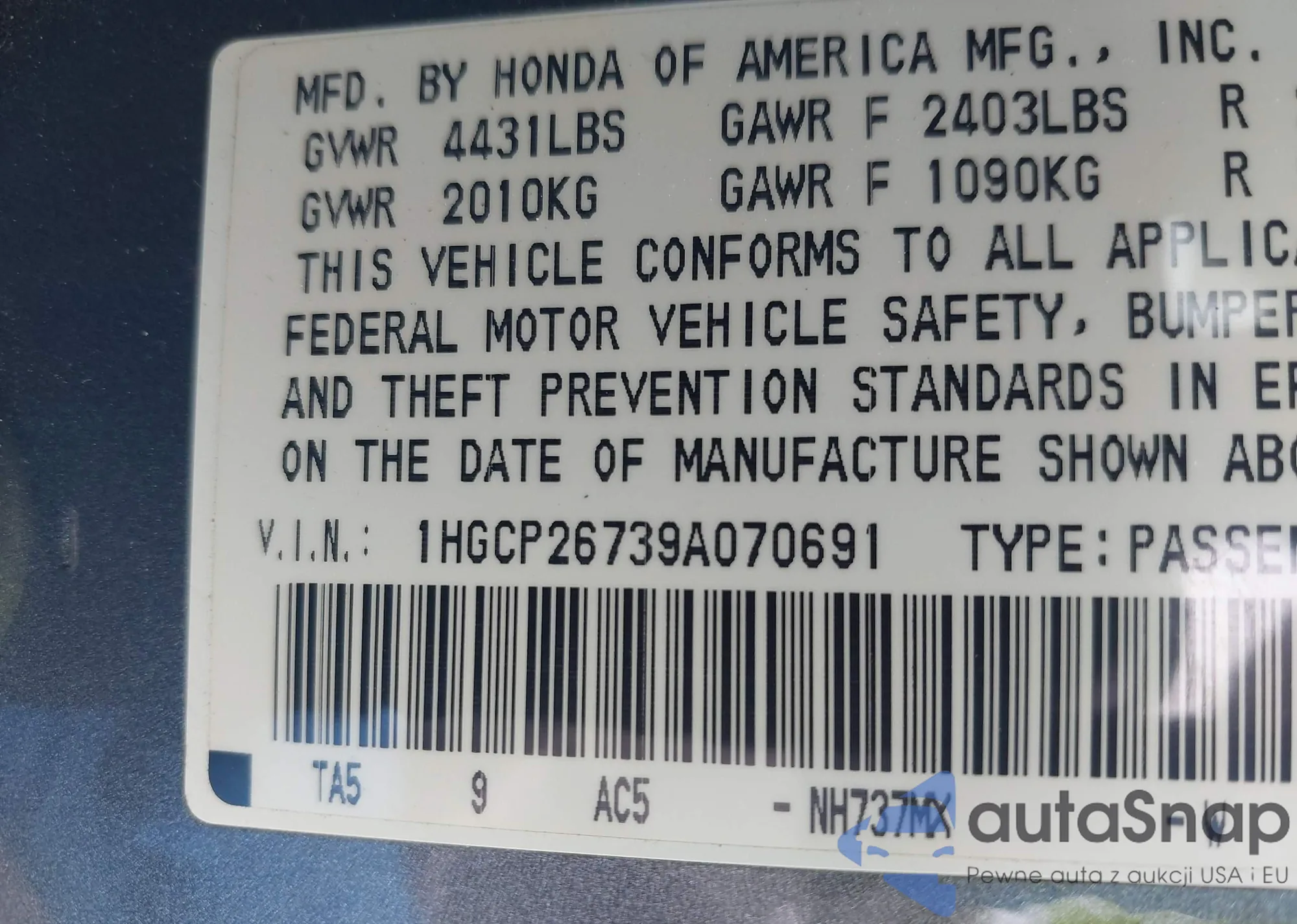 LOT: 42871593 VIN: 1HGCP26718A071269