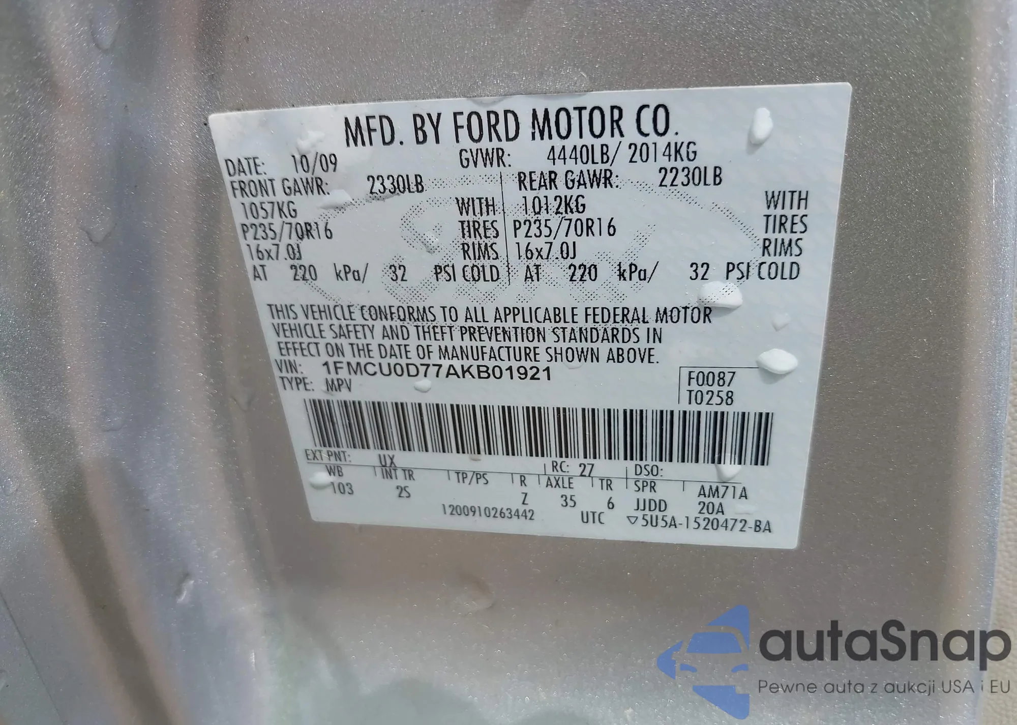 LOT: 42124201 VIN: 1FMCU0D77AKB01921