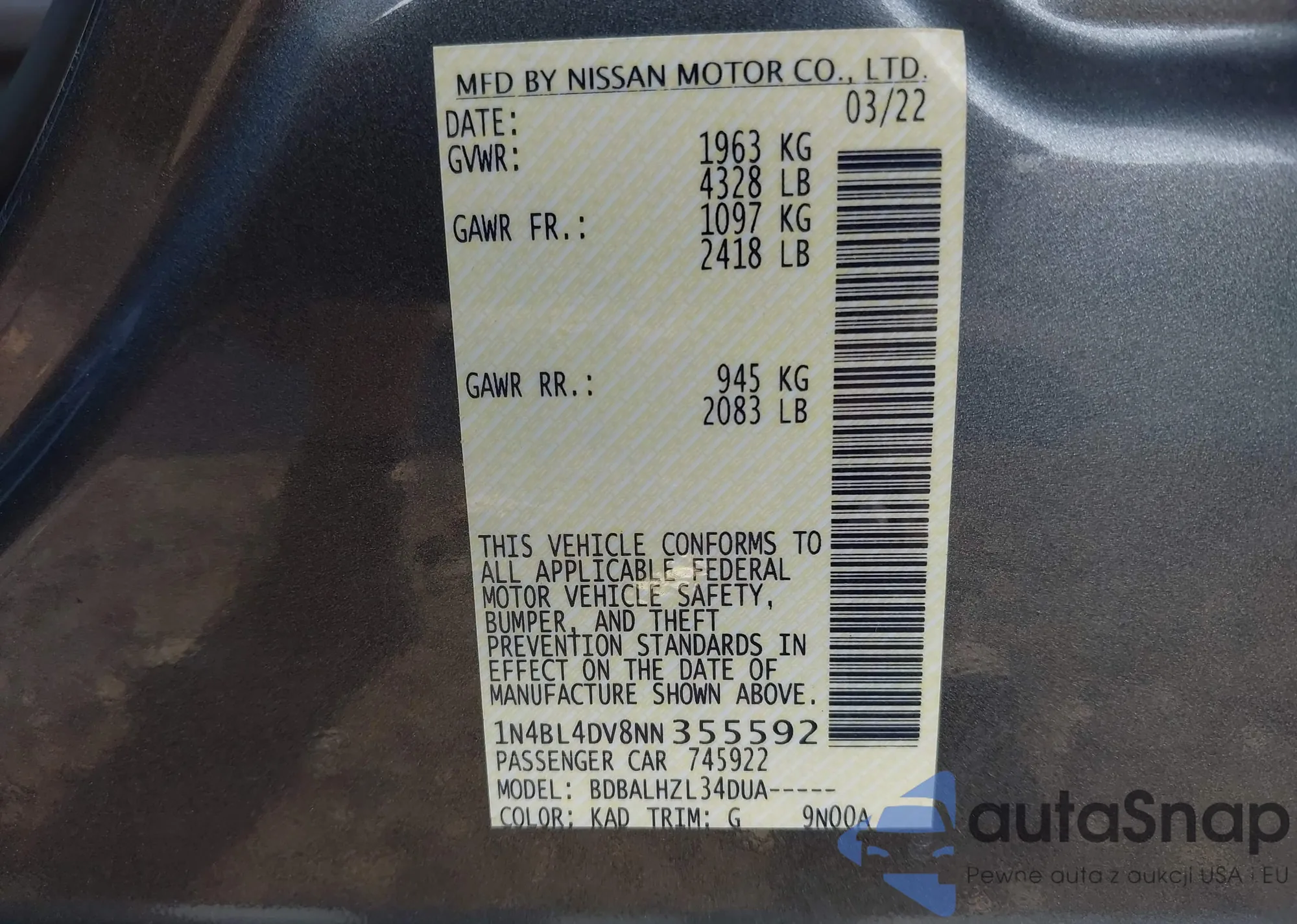 LOT: 42611267 VIN: 1N4BL4DV8NN355592