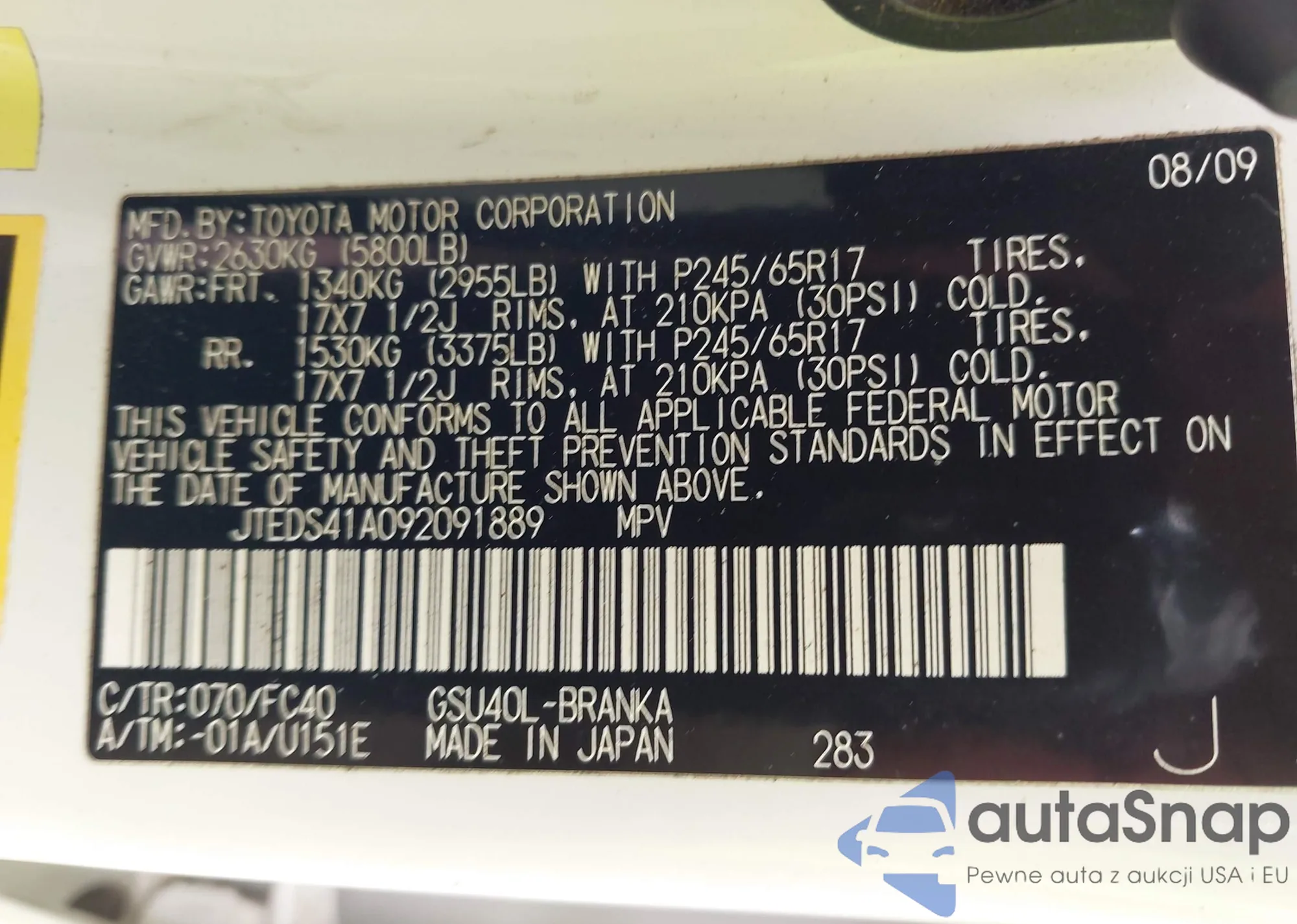 LOT: 42379736 VIN: JTEDS41A092091889