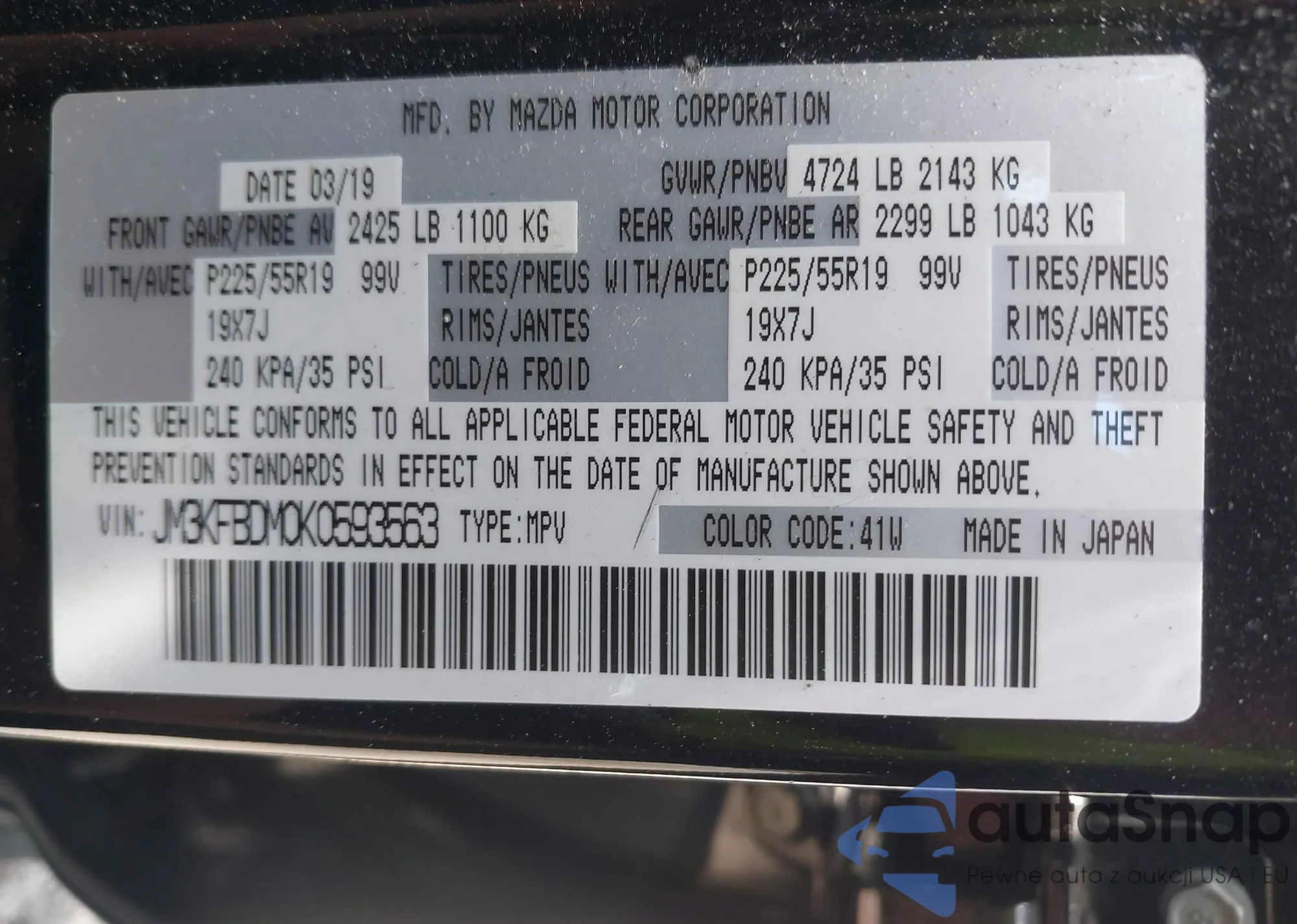 LOT: 39743940 VIN: JM3KFBDM0K0593563