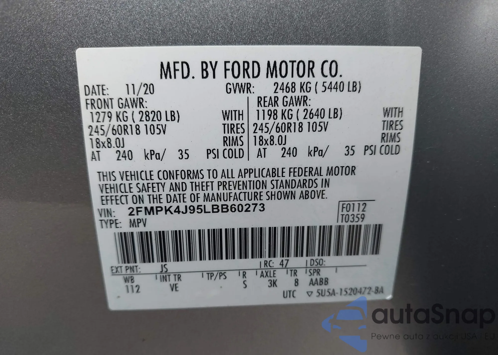 LOT: 42675501 VIN: 1FADP5AU7EL506349