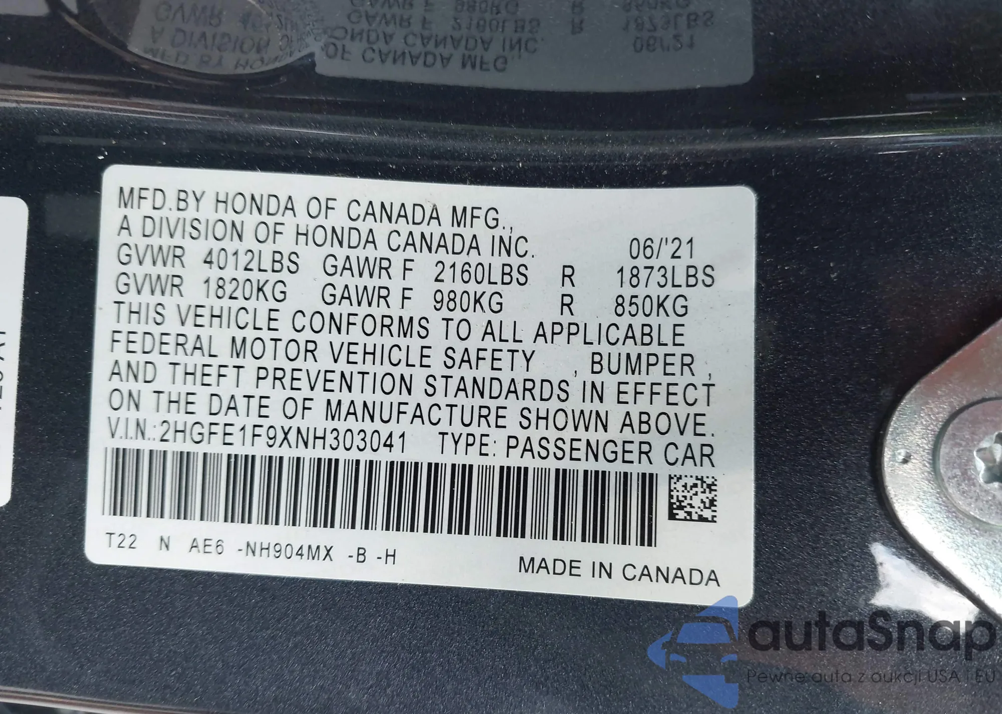 • VIN 2HGFE1F9XNH303041